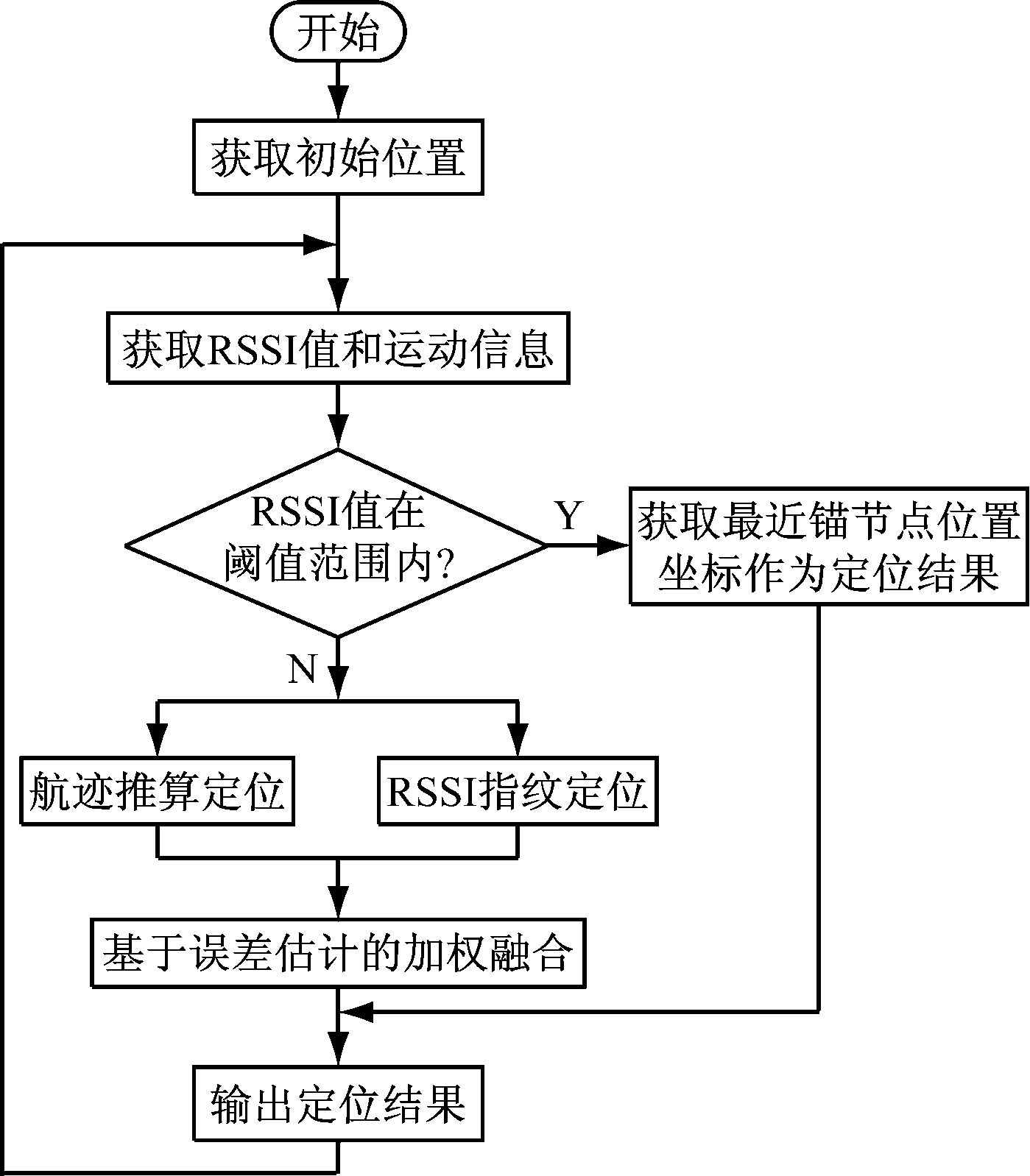 混合定位算法流程如图5所示。在定位起始阶段,利用RSSI指纹定位算法求解目标位置,作为目标航迹推算的初始坐标。在定位过程中,锚节点接收目标运动姿态信息和RSSI值,分别利用K近邻和峰值检测方法求解指纹定位结果和航迹推算结果,最后对2种定位结果进行加权融合,得到最终的目标位置。