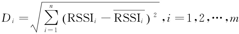 式中:Di为目标节点与第i个参考点的信号强度欧氏距离;n为锚节点个数;i为参考点个数;RSSIi为指纹库中第i个锚节点对应的信号强度;