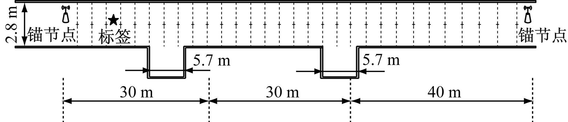 在某模拟巷道内进行系统测试,模拟巷道为直线结构,宽为2.8 m,选取的测试区域巷道长度为100 m,区域内有2个相距约30 m的硐室,如图8所示。