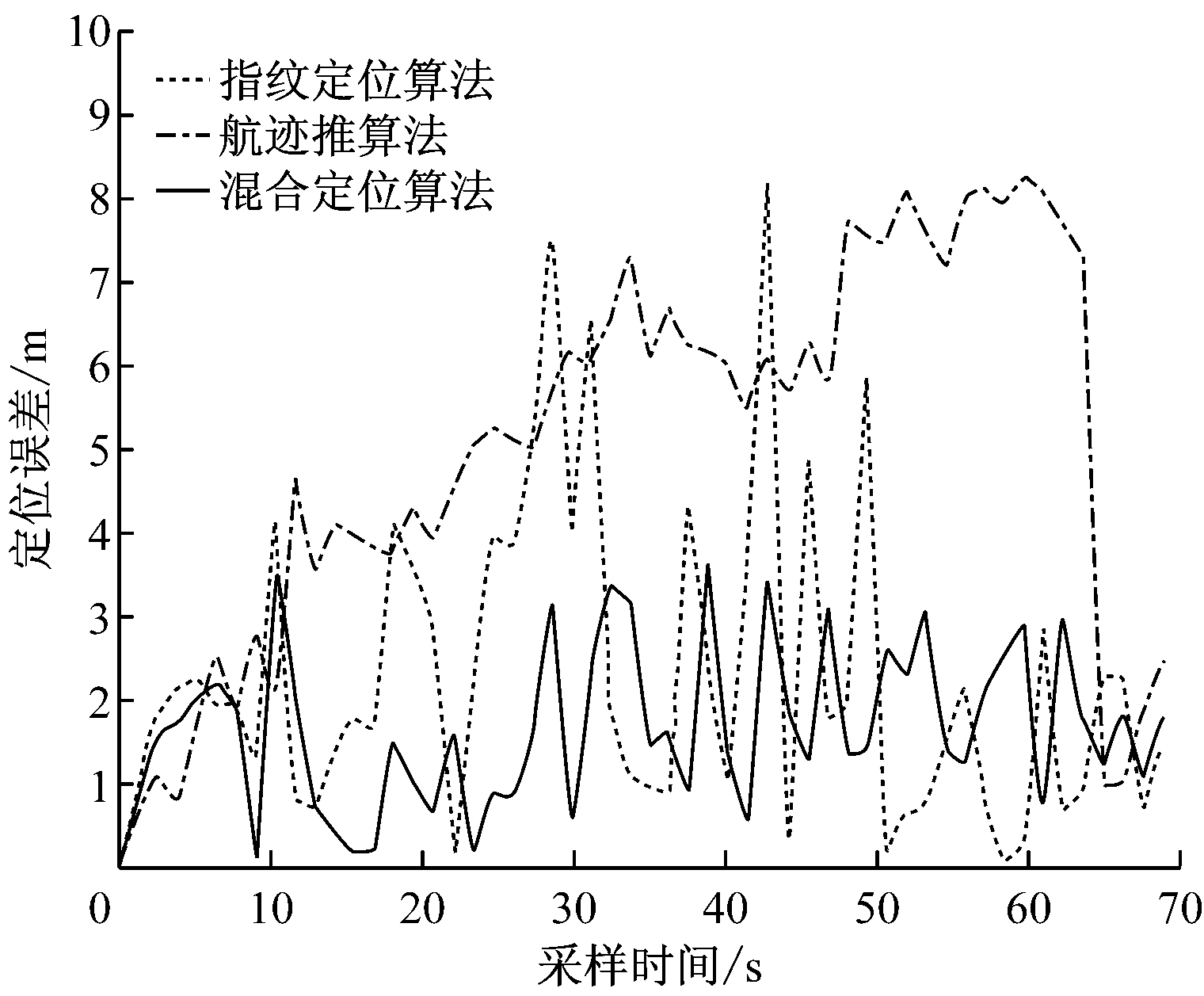 指纹定位算法、航迹推算法、混合定位算法的定位误差如图9所示。从图9可以看出,指纹定位结果存在一定的位置偏移,其误差在靠近锚节点位置处较小,远离锚节点位置处较大。航迹推算的定位误差随着采样时间的增加而增大,存在误差累积现象。当定位标签靠近锚节点2(即采样时间在70 s左右)时,航迹推算误差大幅度减小,误差累积现象明显改善。