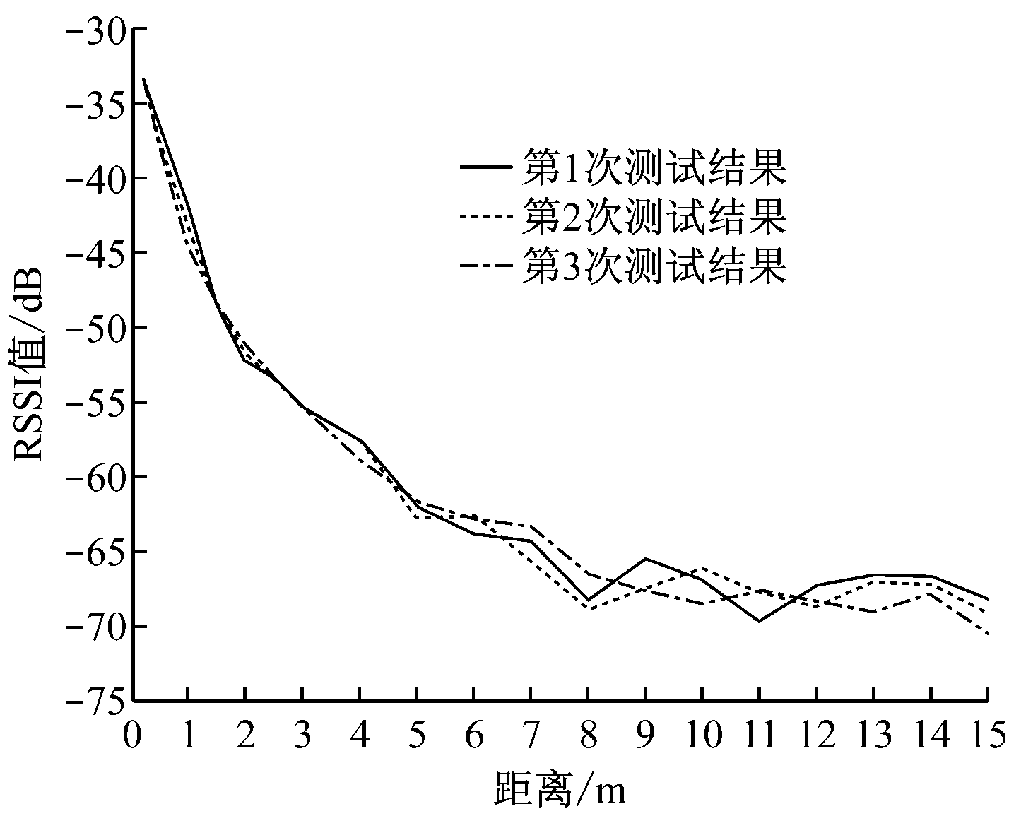 3次实测得到的RSSI值与距离关系曲线如图6所示。从图6可看出,当目标节点与锚节点相距较近时,RSSI值与目标位置对应关系比较好;随着距离的增大,RSSI值的随机误差不断增大。因此,可以根据RSSI值的衰减特性进行短距离辅助定位。设定信号强度阈值R(本文设R=-55 dB),当锚节点收到的目标节点RSSI值大于阈值时,认为运动目标与锚节点距离较短(如3 m),将当前锚节点的位置作为目标节点的实际位置,并将航迹推算的定位时间T置零。这样既保障了目标节点真实位置与纠正位置之间的距离不超过3 m,有效控制了更新位置的误差范围,同时清空了航迹推算过程中的累积误差,有效提高了定位精度。