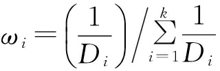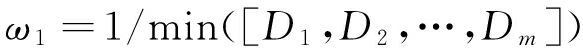 。由于目标节点与锚节点之间的欧氏距离越小,指纹定位结果越精确,所以,定义加权因子ω1: