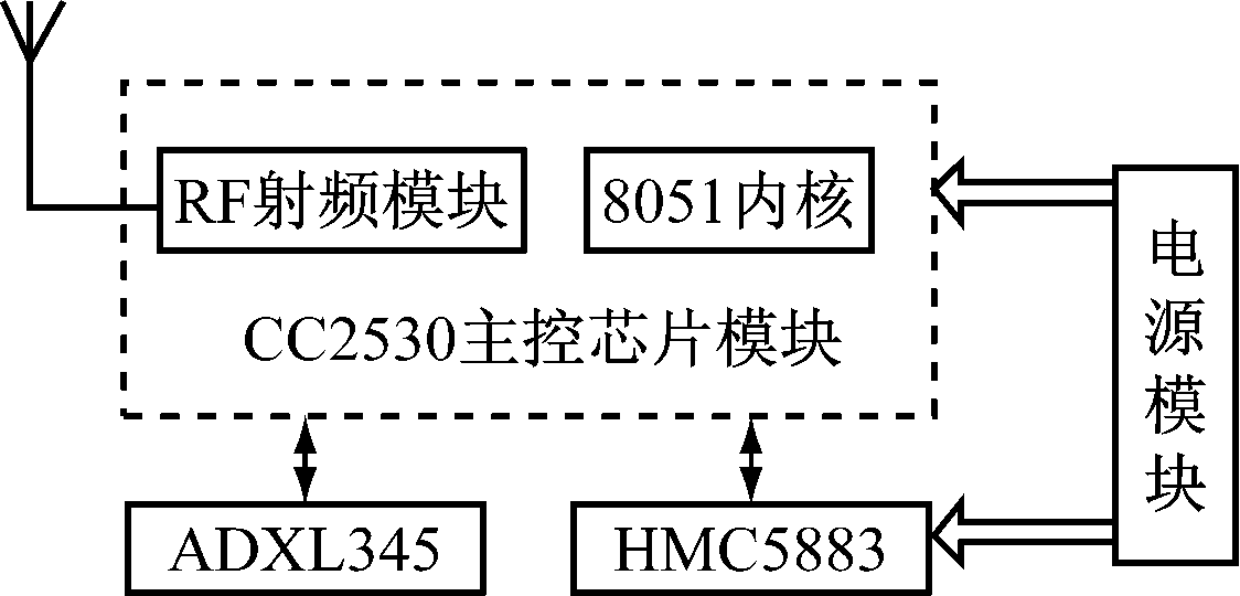 定位标签以CC2530作为主控制芯片,辅以加速度计、磁力计和电源等模块,其结构如图2所示。其中,加速度计ADXL345的量程为±16 g,磁力计HMC5883的量程为±8 Ga。由于锚节点不需要进行数据采集工作,所以,无需包含加速度计和磁力计。