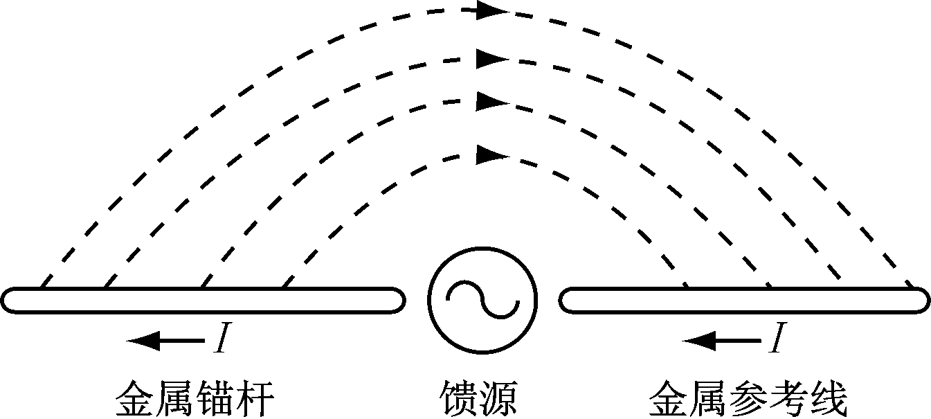 半波偶极子天线由2根金属臂构成。将一根金属参考线作为天线的一臂,与单根金属锚杆一起等效为半波偶极子天线,如图1所示,测量信号从馈源进入天线,I为天线中的电流。这也表明了金属锚杆与天线的等效关系,奠定了采用半波偶极子天线理论来测量金属锚杆长度的理论基础[5-6]。