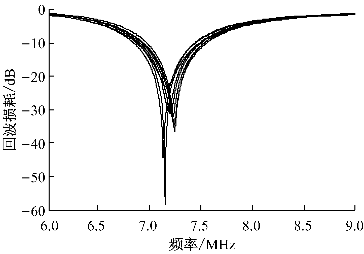 依据变量Δl设置,生成如图2所示的回波损耗曲线,回波损耗最小值对应的频率点即为天线谐振频率点。当Δl=0时,对应的频率值即为对称半波偶极子天线的谐振频率[8]。