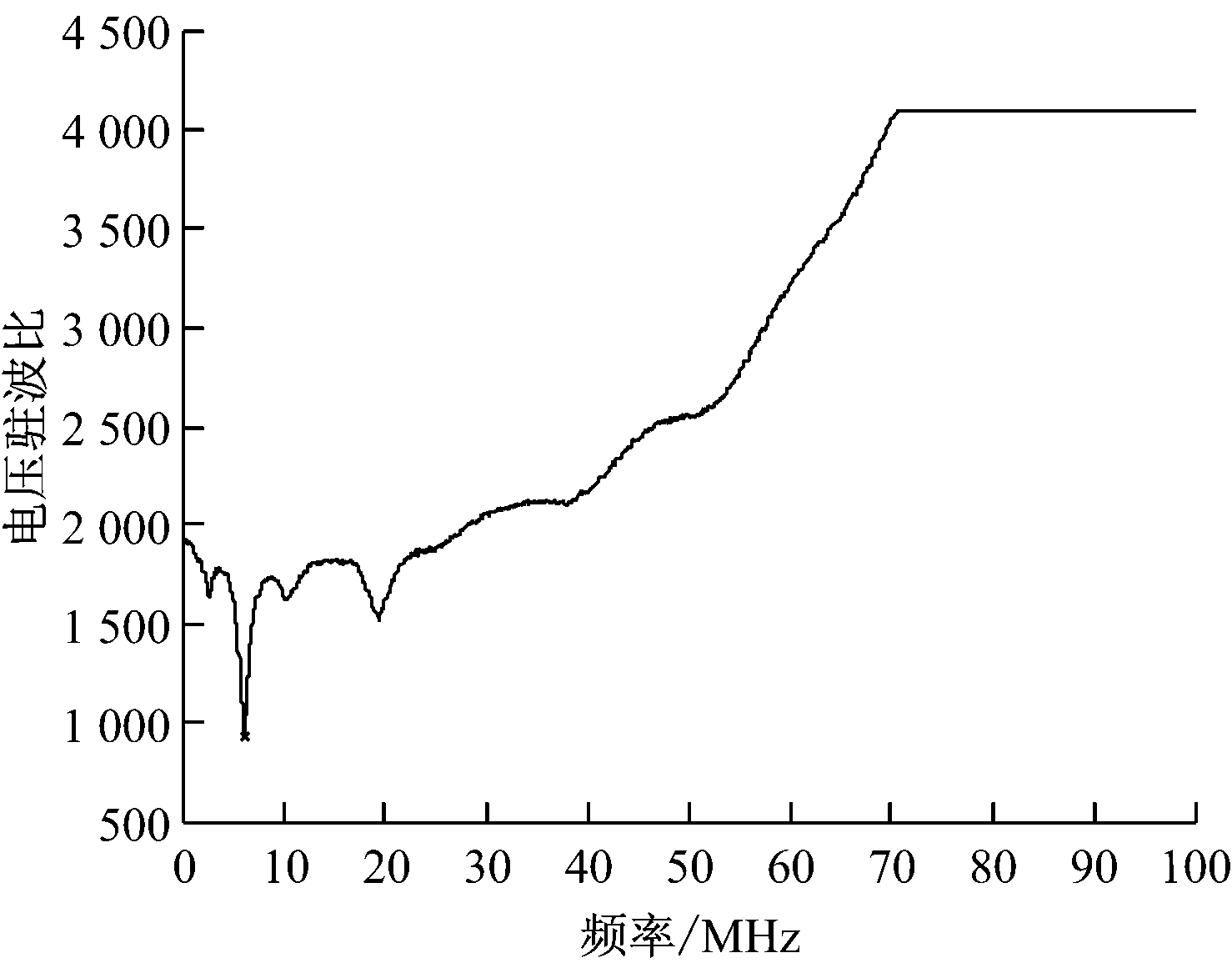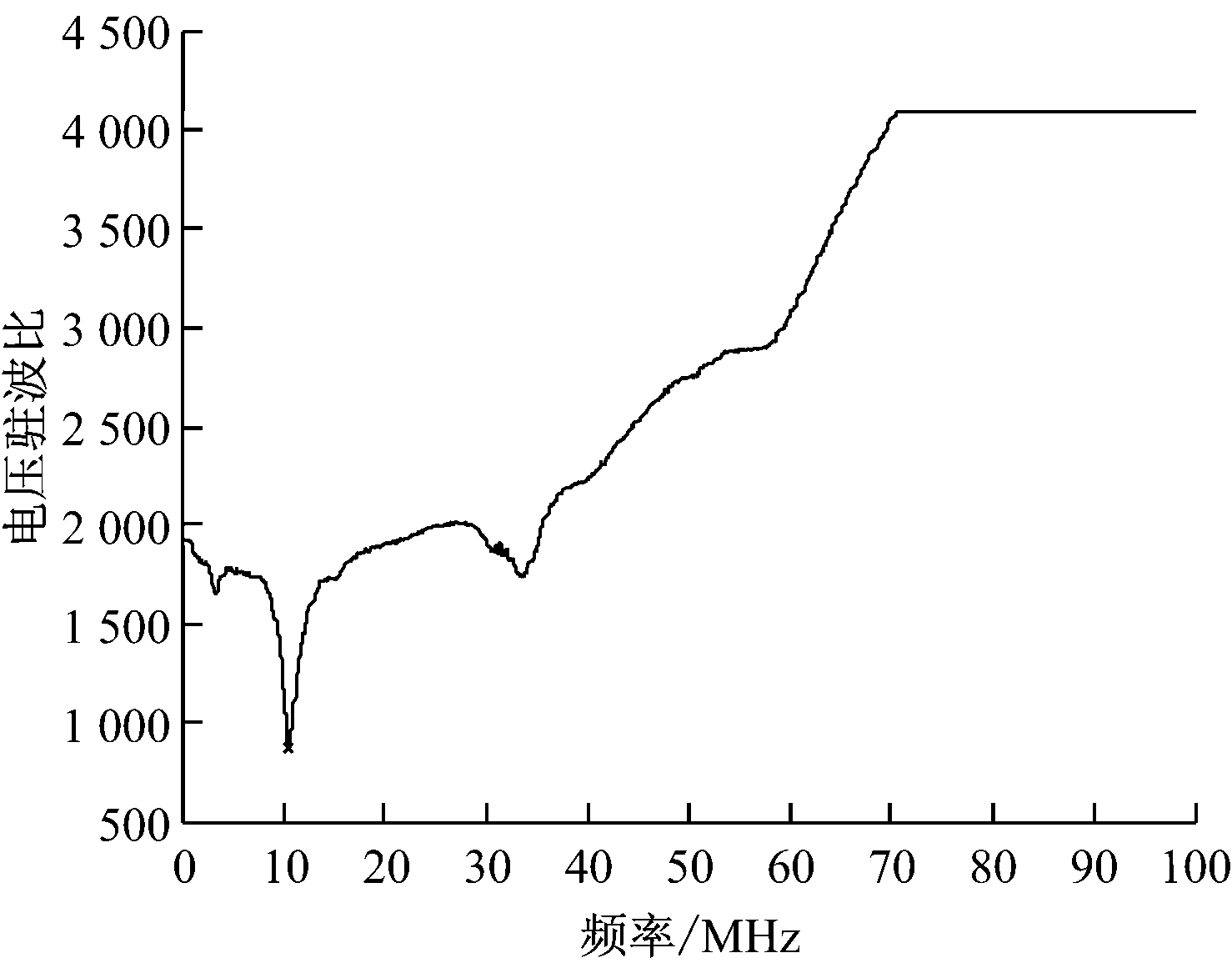 其次,用长度为l3=10 m的金属参考线与被测铜芯线(被测铜芯线实际长度l4=7.5 m)进行测量。图4为测得的电压驻波比与频率关系曲线。