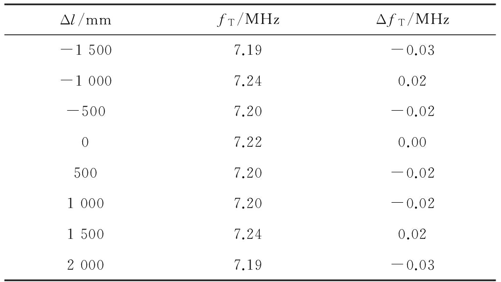 变量Δl值、对应谐振频率fT值、不对称半波偶极子天线相对对称半波偶极子天线谐振频率偏移量ΔfT值见表2。