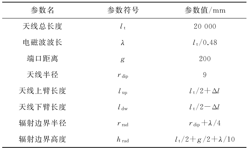 天线仿真参数设置见表1。天线总长度固定,通过改变天线长度变化量Δl来改变天线两臂的长度,Δl范围为[-1 500,2 000],步长为500,单位为mm,天线的材质为铜。端口激励方式设置为集总端口激励,以矩形平面形式将天线的2个臂连接起来。辐射边界条件设置为圆柱体模型,其材质为空气,辐射边界和天线之间的距离为电磁波波长的1/4。