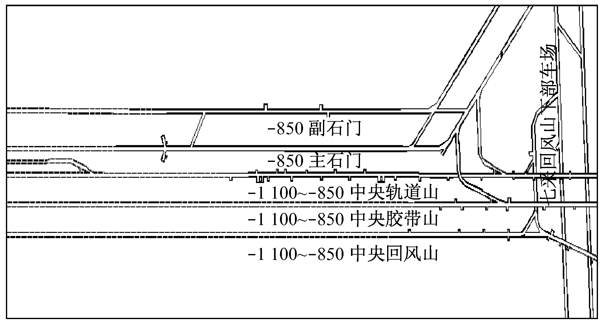 声发射系统应用在该矿的-850主石门揭煤,-850主石门位置如图1所示。该主石门位于三水平首采区——十四采区,为衔接-1100~-850暗立井的重要开拓工程,位于-850西大巷西北方向,开口处在-850西大巷W14点前24.9 m。-850主石门所在的5煤层受断层和原始沉积的影响,煤层厚度不稳定,煤厚为0.2~5.2 m,平均厚度为2.26 m,顶板为灰黑色泥岩,厚度为0.5 m,底板为深灰色粉砂岩,厚度为1.2 m。岩层倾角较缓,平均为8 °。5煤层受断层和地应力的影响,煤层松软易碎,硬度较小,根据施工的地质探查钻孔以及地面钻孔测得5煤层普氏系数为0.19~0.39,瓦斯放散初速度为17.3~23.8 mL/s,瓦斯含量为2.26~10.05 m3/t。