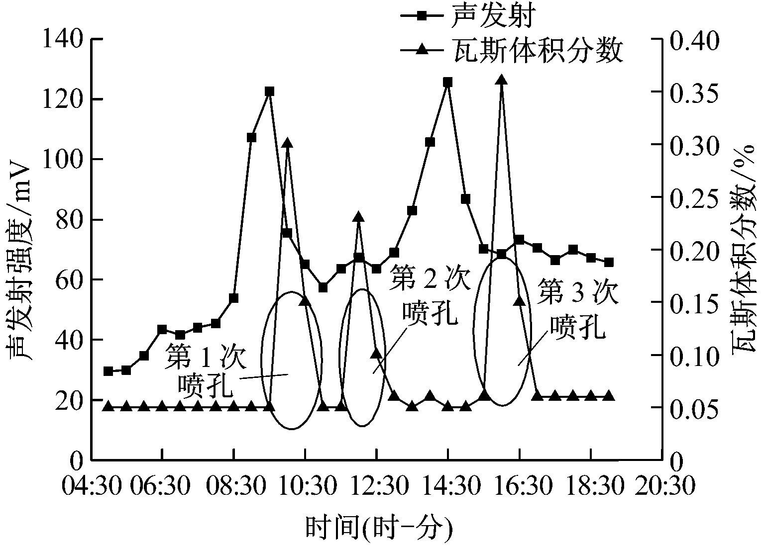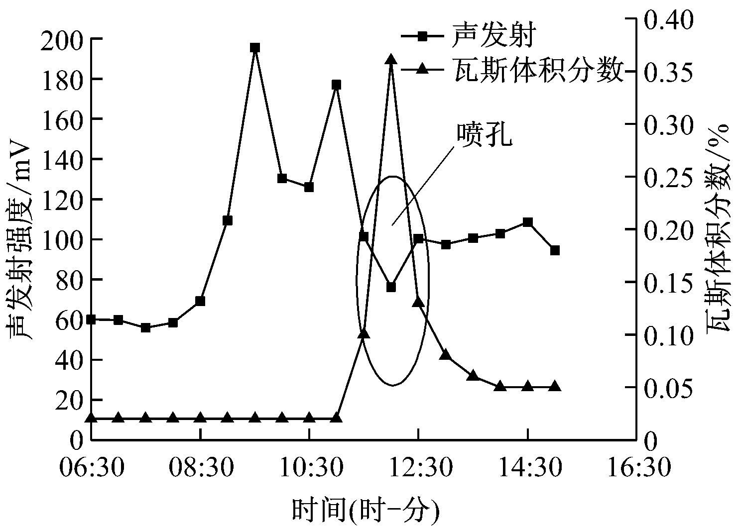 (3) 地质构造复杂,地应力集中,煤层较软,瓦斯含量及瓦斯压力大,喷孔前煤岩体破裂释放能量等导致声发射强度变化超前于瓦斯体积分数升高。
