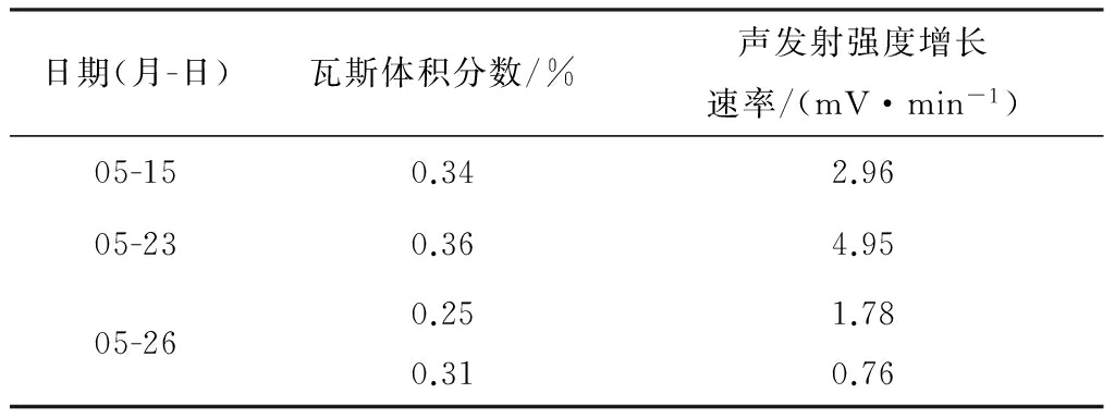 声发射强度增长速率最大值与瓦斯体积分数变化的关系见表1。从表1可以看出,瓦斯体积分数变化大,声发射强度增长速率快,两者的变化不是直接的线性关系,但具有较好的吻合一致性。从表1中喷孔声发射强度增长速率对比可以发现,声发射强度增长速率越快,喷孔动力现象越明显;26日声发射强度增长速率没有前2次增长速率快,且瓦斯体积分数变化差值比15日和23日变化小,这是因为这次是间断式多次喷孔,能量得到了缓慢的释放,但从总体能量来看,26日喷孔规模要强于前2次,所以,声发射强度增长速率能部分反映出喷孔强度变化,声发射强度增长速率越快,喷孔动力越强。