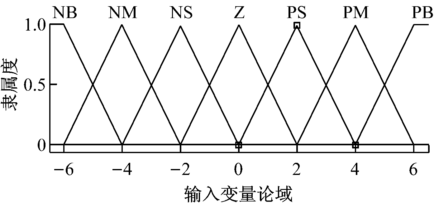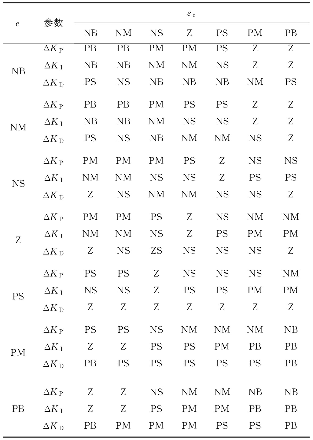 胶带速度偏差e、偏差变化率ec以及输出变量ΔKP、ΔKI和ΔKD的语言值皆选取7个模糊量,即{负大(NB),负中(NM),负小(NS),近似零(Z),正小(PS),正中(PM),正大(PB)},其论域皆取值为{-6,-5,-4,-3,-2,-1,0,1,2,3,4,5,6},共13个等级。