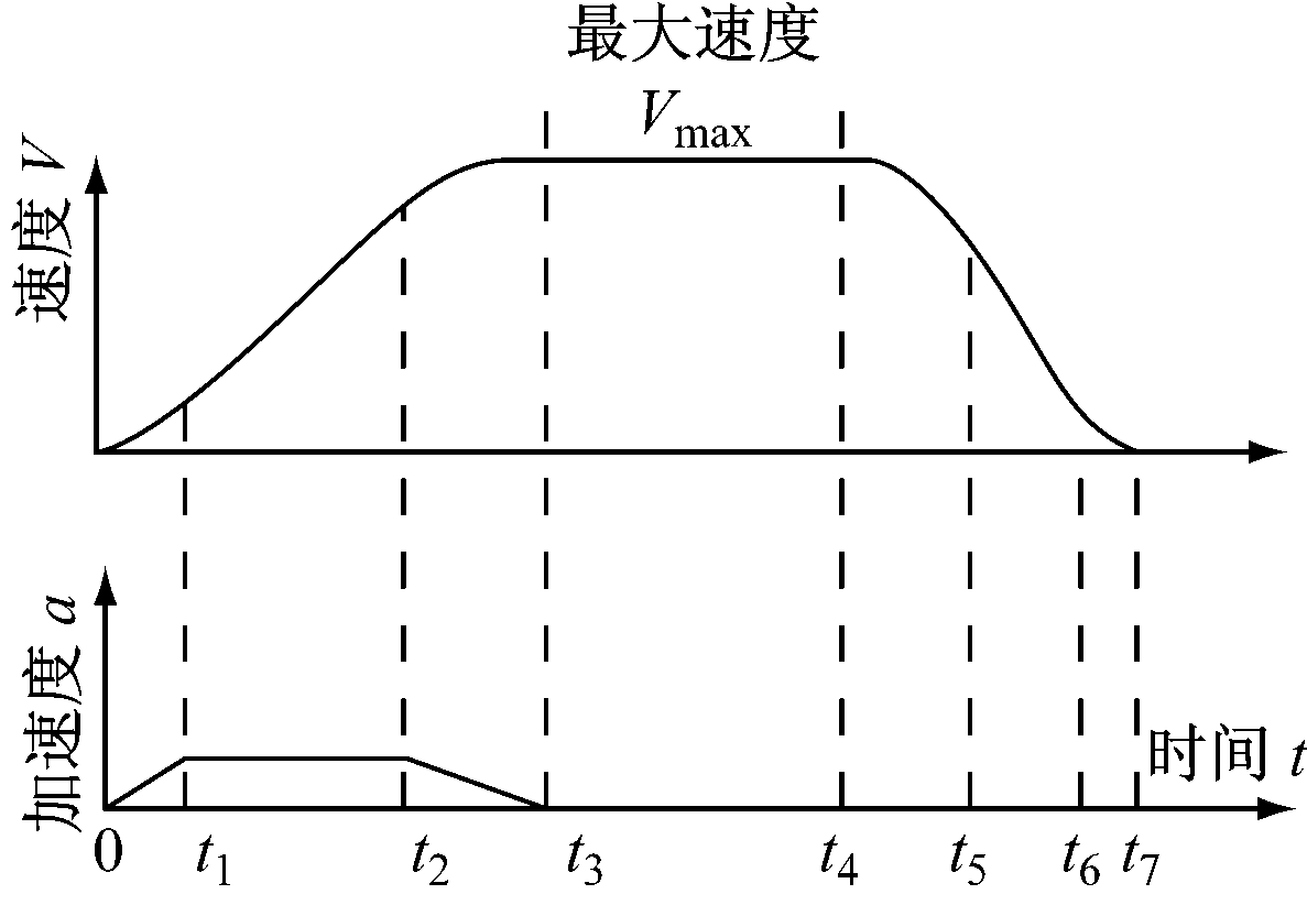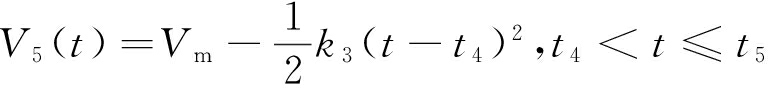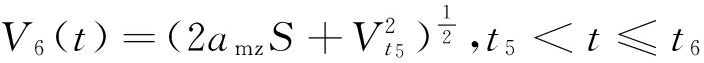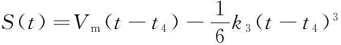 式中:V5为t4~t5段速度,m/s;k3为t4~t5段加速度的变化率,m/s3;S(t)为恒减速阶段的行程值,m;V6为t5~t6段速度,m/s;amz为停车制动段最大加速度,m/s2;Vt5为t5点的速度,m/s;V7为t6~t7段速度,m/s;Vt6为t6点的速度,m/s;kz4为t6~t7段加速度的变化率,m/s3。