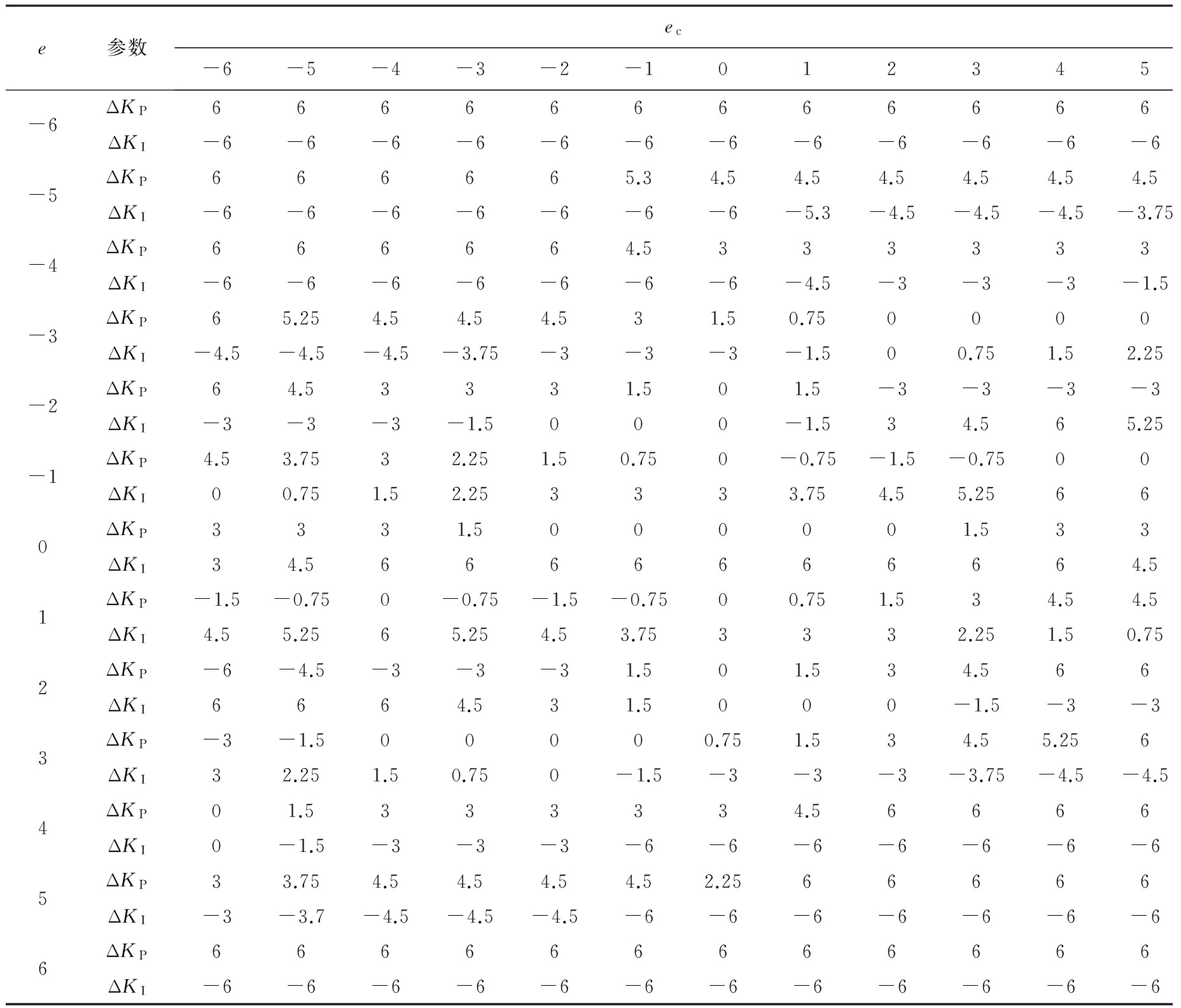 为了保证控制规则的灵活性与细致性,又兼顾其简单与易行的要求,根据实验分析,设置模糊控制的语言变量取值与模糊论域:电流偏差e和偏差变化率ec的模糊集合均取7个语言值,分别为{负大(NB),负中(NM),负小(NS),近似零(Z),正小(PS),正中(PM),正大(PB)};输出变量(比例系数增量ΔKP和积分系数增量ΔKI)的模糊集均取5个语言值,分别为{负大(NB),负小(NS),近似零(Z),正小(PS),正大(PB)}。输入、输出变量的基本论域都选为{-6,-5,-4,-3,-2,-1,0,1,2,3,4,5,6},共13个等级。