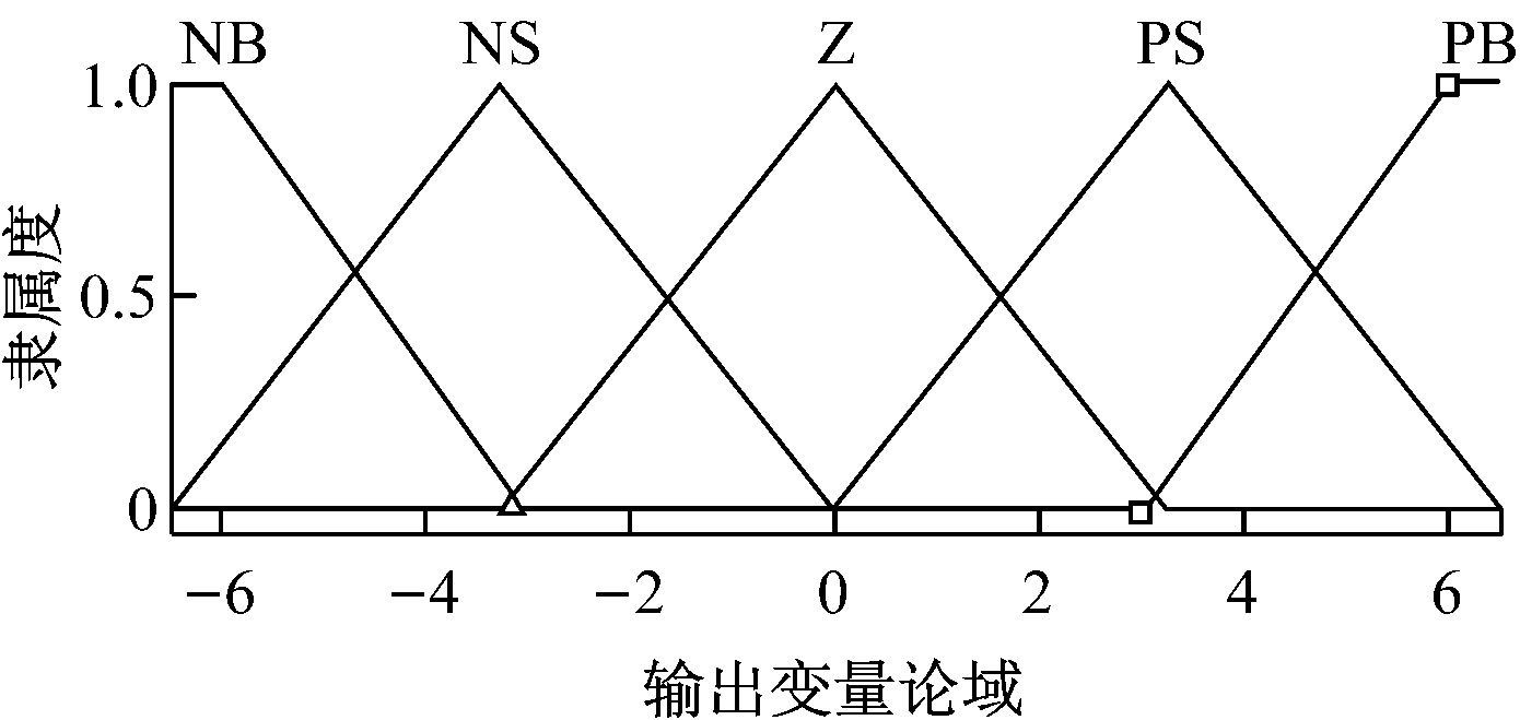 由于三角形隶属函数具有较高的灵敏度,所以输入、输出变量都采用三角形隶属函数,其相应的隶属度函数曲线如图5和图6所示。