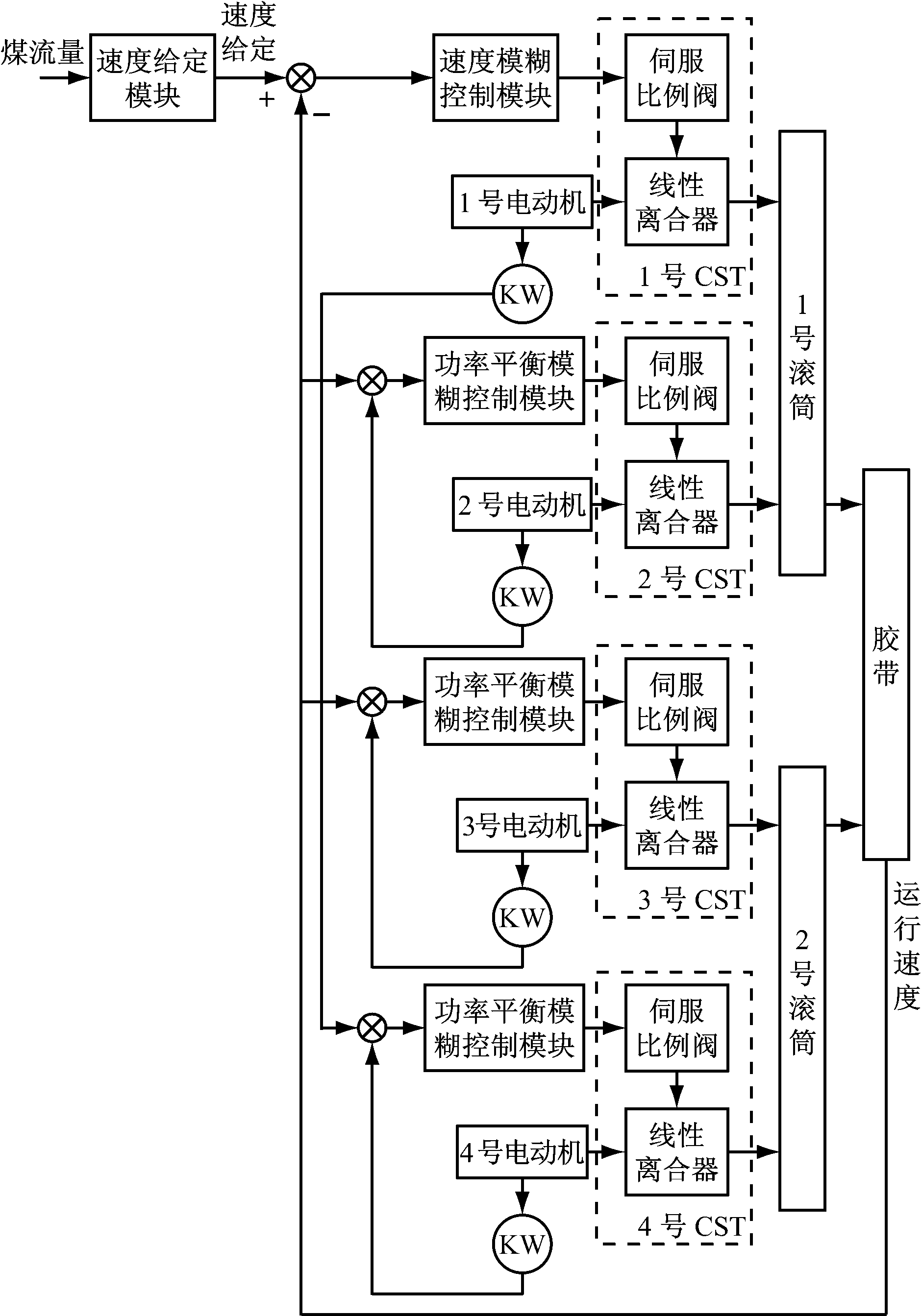 针对带式输送机重载启动与停止过程中物料(煤块)下滑或滚动以及动态张力对设备的机械损伤问题、轻载或无负载高速运行状态下机械传动机构的过度磨损和电能浪费问题、多电动机间的功率平衡问题,提出了如图2所示的带式输送机总体控制模型。该控制模型主要由速度设定模块、速度模糊控制模块、功率平衡模糊控制模块等组成,采用双闭环结构。内环由功率平衡模糊控制器组成,其策略如下:采用主从控制模式,即将 1号电动机的电流作为2号—4号电动机电流的给定值,当2号—4号电动机电流与1号电动机电流不一致时,功率平衡模糊控制器通过自动调节2号—4号CST的伺服比例阀的开度去改变电动机的出力,从而实现4台电动机功率平衡控制。外环由速度模糊控制模块组成,其基本原理如下:将胶带运行速度与给定速度相比较,当胶带运行速度与给定速度不一致时,控制器首先逐步调节1号CST伺服比例阀的开度,从而改变1号电动机的出力,其他3台电动机自动跟踪1号电动机的输出功率,4台CST共同作用实现胶带的速度调整。速度设定模块根据胶带中的煤流量大小确定启动、停止以及正常运行时胶带的给定速度。