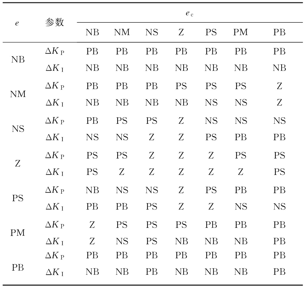 根据对PID参数的整定要求,采用“If E is A and EC is B then ΔKP,I is C”的控制规则语句,得到ΔKP和ΔKI的模糊控制规则,见表1。