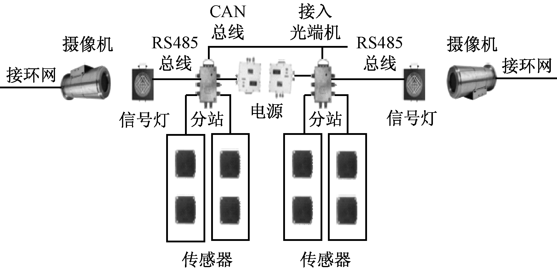 实现胶轮车运输监控最重要的是要实时准确地检测出胶轮车位置。现有的胶轮车运输监控系统大多采用2.4 GHz射频技术实现胶轮车的区域定位,车辆识别范围较大,当避让硐室较密集时,射频信号重叠,容易造成位置识别错误[2]。另外,采用射频技术时,需要在巷道内安装大量的位置识别标志器,位置识别标志器通过线缆与监控分站连接,增加了工程施工及后期维护难度,不利于胶轮车运输监控系统的推广。本文提出一种基于物理检测方式的胶轮车运输监控系统。该系统采用检测地磁变化的机车位置传感器或检测巷道高度变化的超声波物位传感器获得车辆出入列信息,车辆调度控制分站根据车辆信息进行控制逻辑计算,然后对信号灯进行控制。