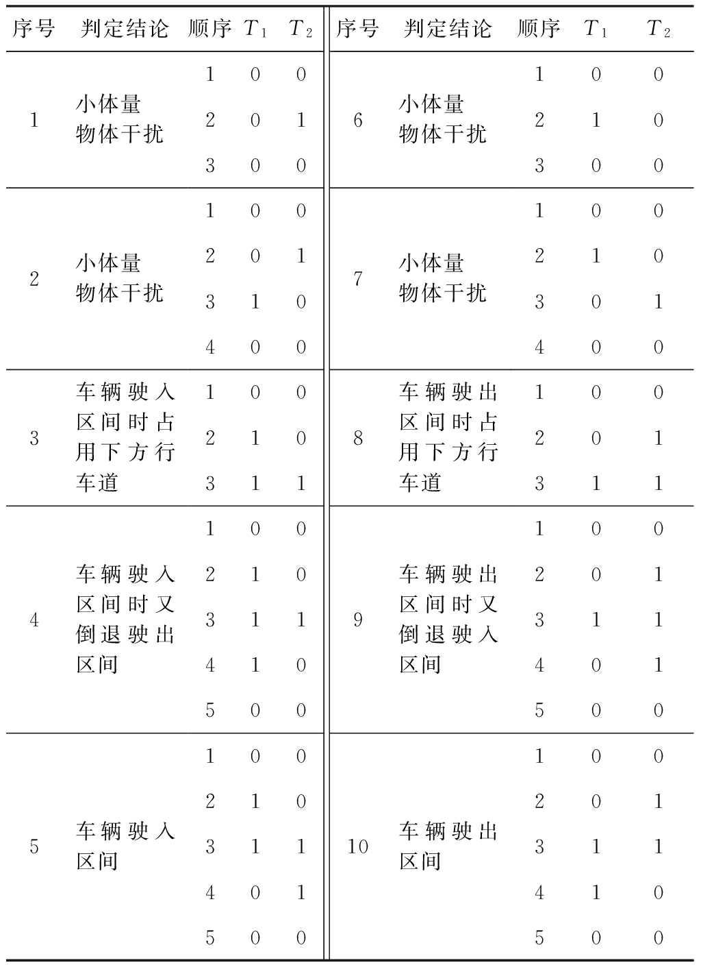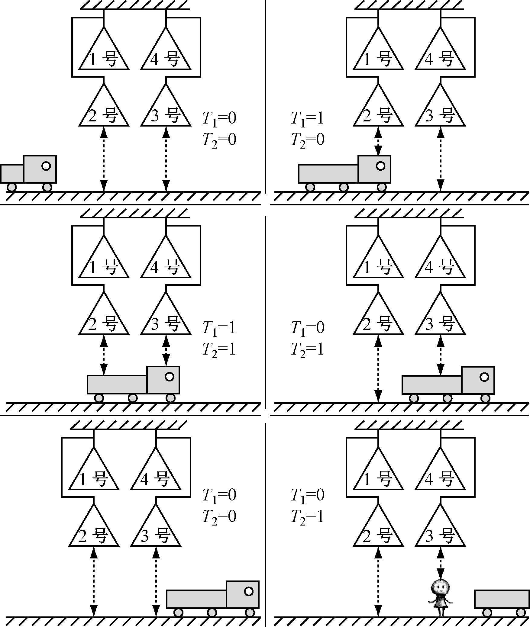 系统采用机车位置传感器或超声波物位传感器获取胶轮车位置[3]。机车位置传感器测量地磁场强度并以频率信号输出,超声波物位传感器利用超声波测量距离并以频率信号输出[4]。当有车辆经过传感器时,传感器的输出频率会发生变化,车辆调度控制分站检测频率信号的变化,捕获车辆经过的事件,并通过检测车辆经过前后2组传感器产生时间的顺序判断是否有车辆经过,避免其他移动物体经过造成车辆通过的假象。由于每台传感器的检测范围有限,为了适应较宽巷道应用,通过传感器冗余方式来增大检测面积。车辆调度控制分站检测车辆经过过程如图2所示。T1为1号、2号传感器位置的车辆经过状态,T1=0代表1号、2号传感器位置无车辆到达,T1=1代表1号、2号传感器位置有车辆到达;T2为3号、4号传感器位置的车辆经过状态,T2=0代表3号、4号传感器位置无车辆到达,T2=1代表3号、4号传感器位置有车辆到达。胶轮车判定逻辑见表1,其包含了判定车辆及小物体干扰的所有方法。