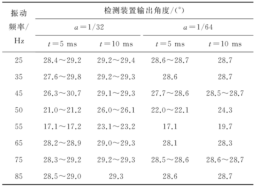 结合理论与实践来选择合理的采样周期t和滤波系数a值,分别将采样周期t设为5,10 ms,每5,10 ms触发一轮采样并取平均值;分别取a为1/32,1/64进行实验。将装置以30°左右的角度固定在振动实验台上,进行变频振动实验,观察装置检测结果,实验数据见表1。