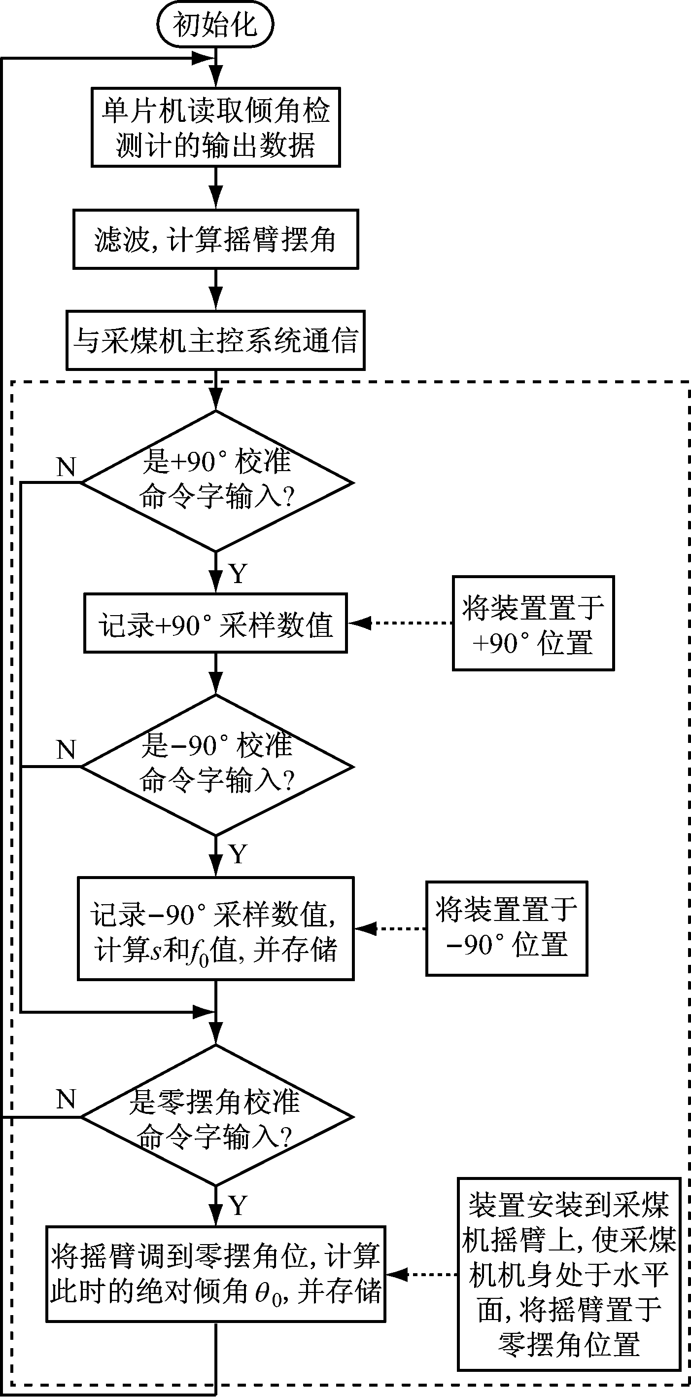 装置主程序流程如图3所示。图3中虚线框内步骤为装置校准时用,一般在采煤机出厂前对装置进行校准,出厂后用户不需要校准。