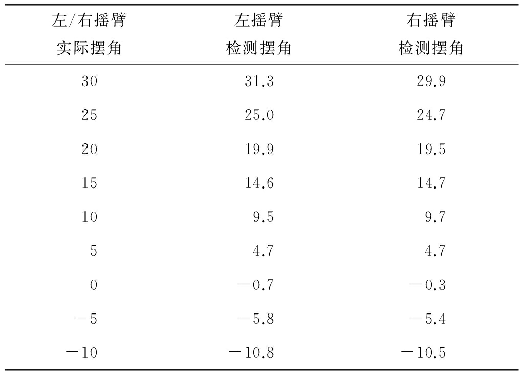将2个校准好的摆角检测装置分别安装于采煤机左右摇臂上,将摇臂置于零摆角位。输入零摆角校准命令字,确定零摆角位并存储下来,摆角检测装置即可正式使用了。分别将左右摇臂升降到一定角度,观察装置的输出,比较装置检测到的摇臂摆角与实际摆角的差别。表2为一组测试数据。