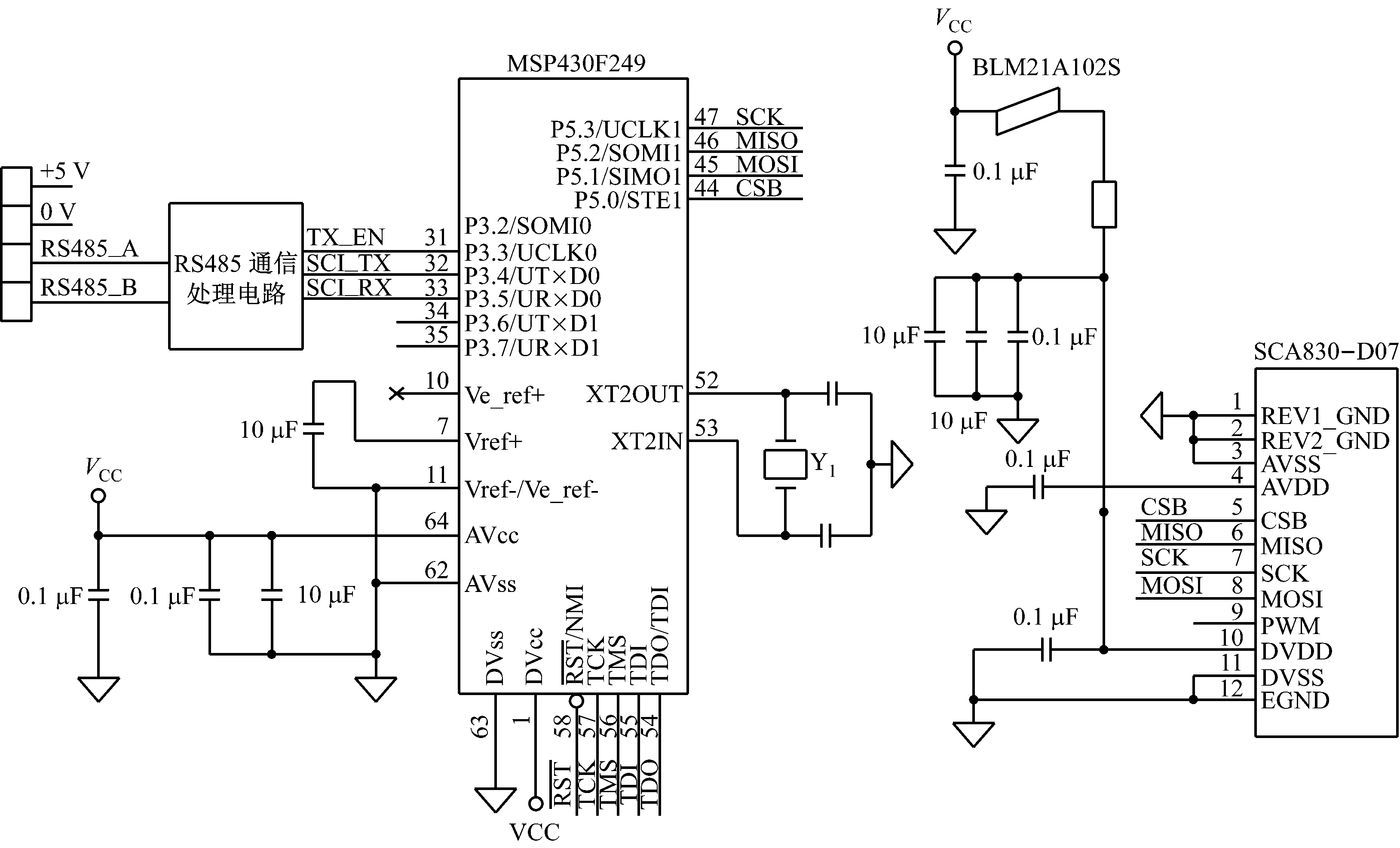 基于重力加速度的采煤机摇臂摆角检测装置由SCA830倾角检测计、外围电路、MSP430F249低功耗单片机等组成。SCA830倾角检测计是基于重力加速度的单轴倾角检测仪器,其量程为±1g,具有SPI数字通信接口,输出代表加速度大小的AD转换值(输出范围为-32768~32768)。单片机读取SCA830输出的数字量,计算出装置当前的绝对倾角,然后再根据装置敏感轴与摇臂摆动轴间的固有夹角及采煤机机身当前倾角计算出采煤机摇臂的实际摆角,最后将摆角信息通过RS485总线传输给采煤机主控系统,主控系统再计算滚筒当前采高。