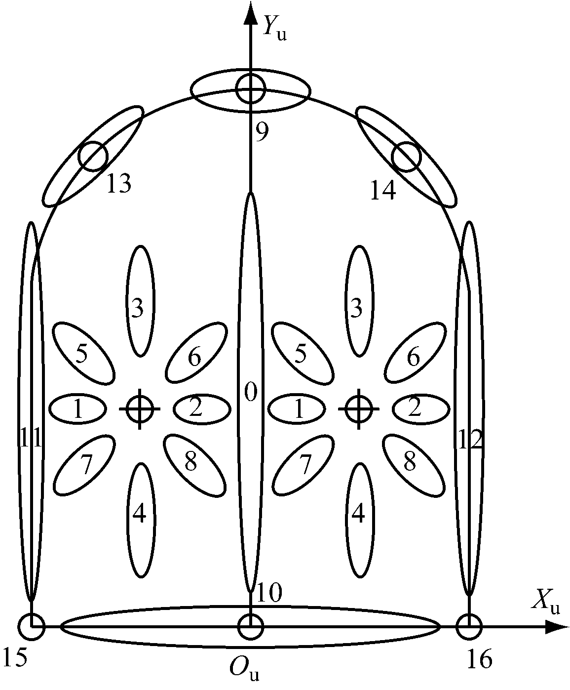 针对煤矿常见的拱形巷道,在作业面上建立用户坐标系,如图4所示。Ou在底部直线的中点,Xu在底部向右为正,Yu在作业面的左右对称线上向上为正,Zu垂直于工作面向外为正。确定钻臂目标姿态前需要先找几个特征孔(钻车初始位,即钻杆水平的理想位姿时,钻头正对工作面的2个孔;最上面的1个孔,最下面的3个孔;圆弧左右侧45°处2个孔)。然后将所有孔分为16个区域,其中Yu轴左侧的孔由左侧钻臂钻孔,Yu轴右侧的孔由右侧钻臂钻孔,Yu轴上的孔可根据情况选择由左侧或右侧钻臂钻孔。钻孔方案如图4所示。对这16个区域分别设定钻杆末端的目标位姿,见表1。