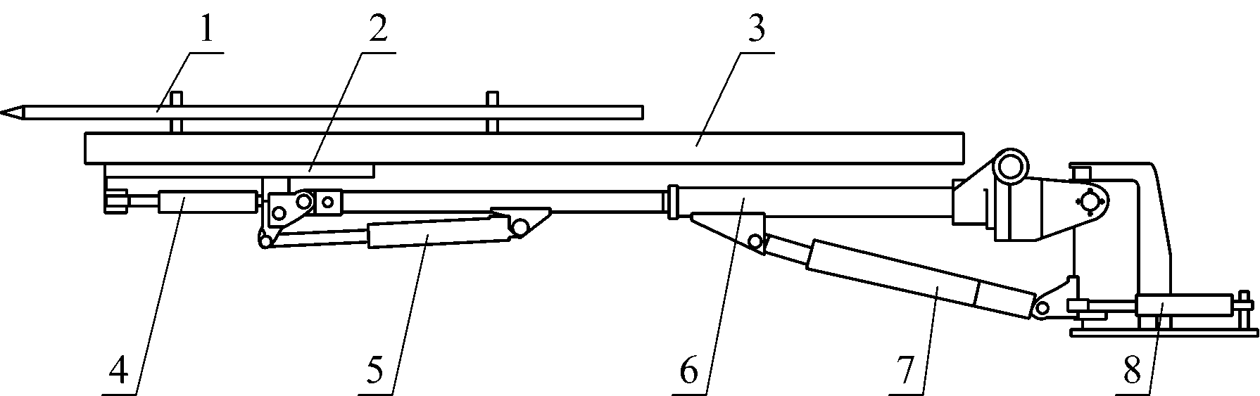1-钻杆; 2-滑架; 3-推进器; 4-摆角油缸; 5-俯仰油缸;6-回转臂; 7-升降油缸; 8-整臂摆动油缸