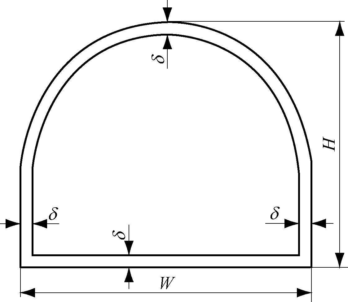 在钻车实际工作中,还要考虑实时碰撞检测问题,需给出一个安全范围δ(钻臂实际工作时与巷道壁的最小距离)。本文采用煤矿作业时最常用的拱形巷道,巷道作业面宽度为W,高度为H,如图3所示。钻孔规划碰撞检测时δ=0,实时碰撞检测时δ≠0。