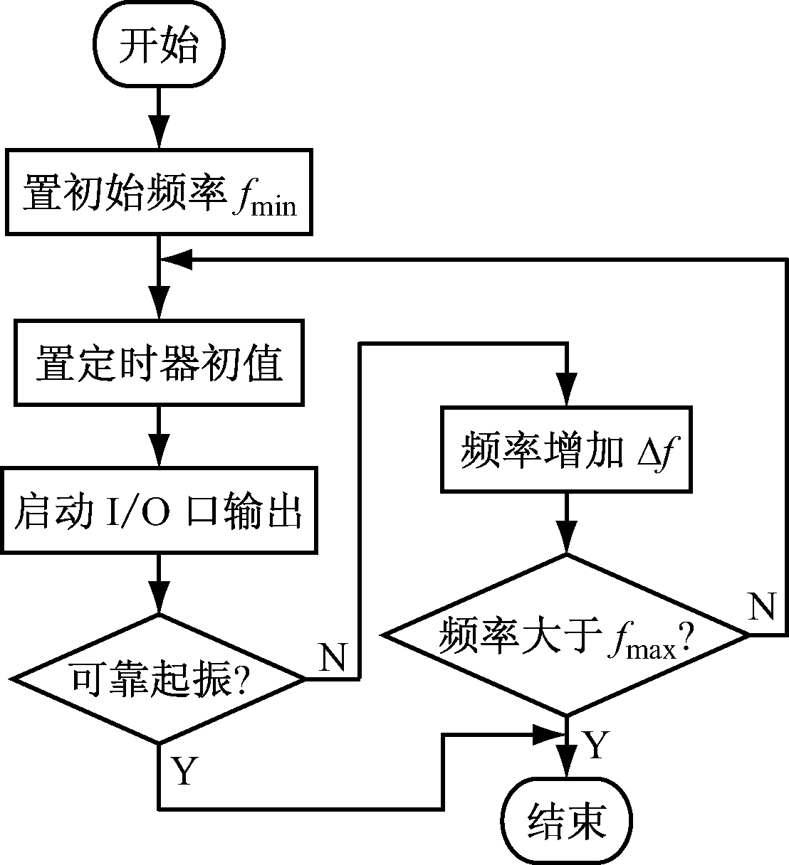 上下限频率和频率增量都不是固定值,首先以400 Hz为下限,以 5 000 Hz为上限,100 Hz为频率增量进行扫频,当反馈脉冲大于4个时,上限频率就变为当前频率加100 Hz,下限频率为当前频率减100 Hz,频率增量变为10 Hz,重复扫频;当反馈脉冲大于8个时,上限频率就变为当前频率加10 Hz,下限频率为当前频率减10 Hz,频率增量变为1 Hz,重复扫频;当反馈脉冲大于12个时,就认为是可靠起振。