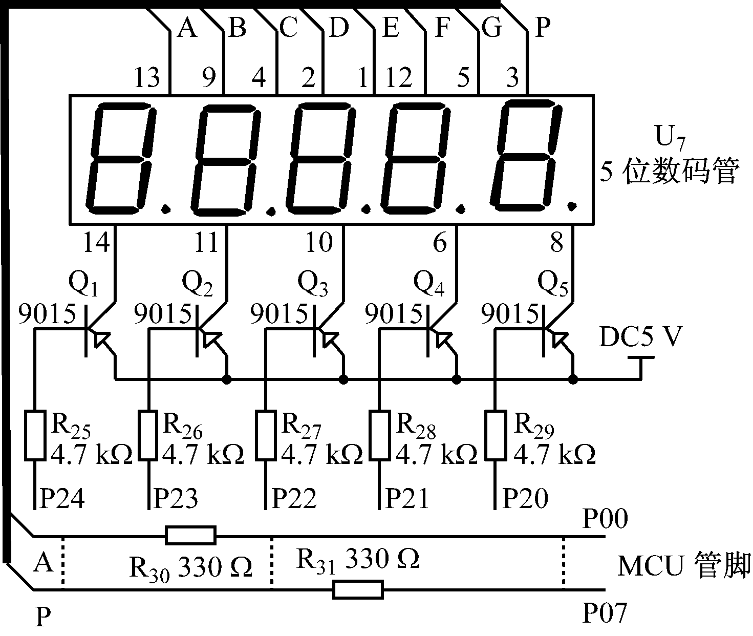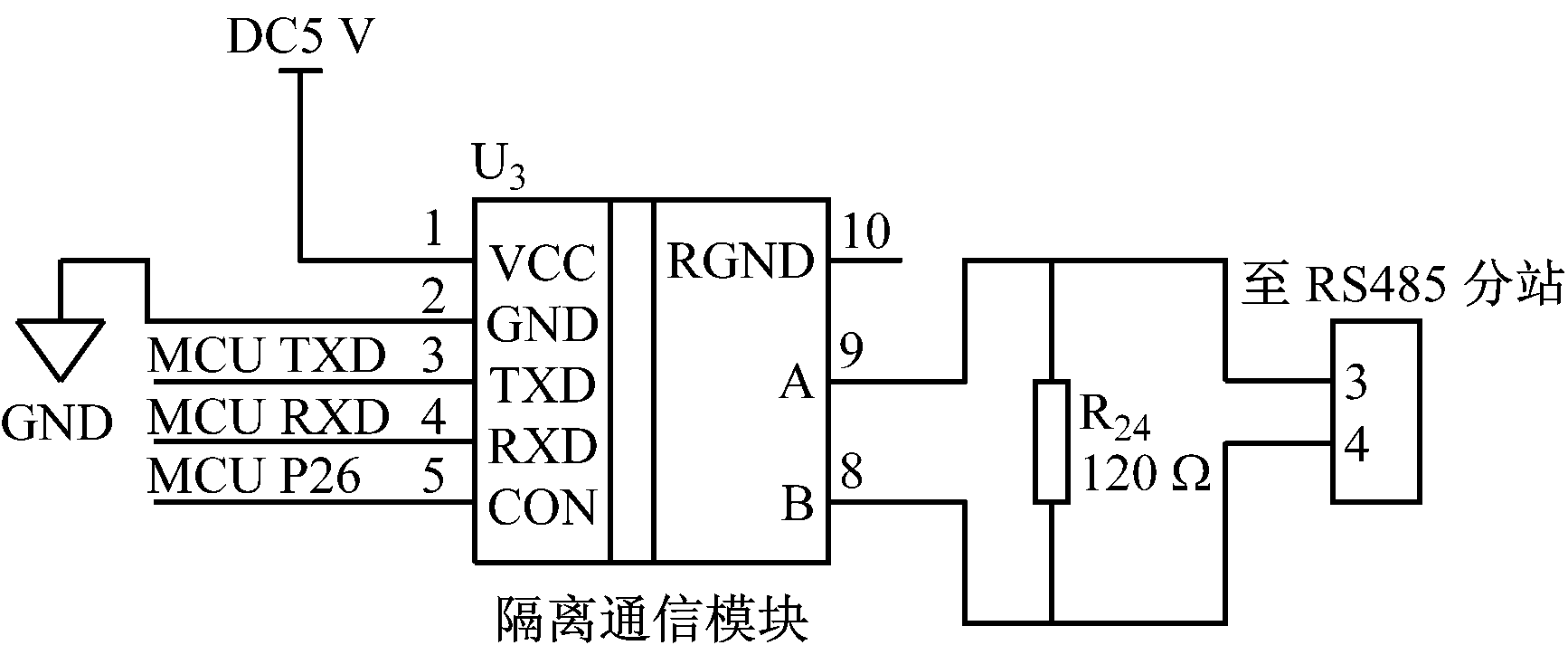 采集仪器采集的数据一部分用于本地数码管显示,一部分通过RS485与地面计算机进行双向实时通信,定时向计算机传输当前监测数据,随时接收计算机的命令,提高了仪器的实用性和整体监测系统的可靠性。RS485通信电路如图6所示,采用隔离通信模块,以确保本质安全及抗干扰性能。显示电路如图7所示。