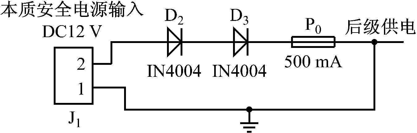为确保仪器在井下的安全使用,供电电路需要符合本质安全设计标准。仪器采用矿用隔爆兼本质安全型直流稳压电源KDW660/12B供电,KDW660/12B输入为AC127 V或660 V,输出为DC12 V,额定电流输出为1 000 mA,过压保护值为13 V,过流保护值为1 150 mA。仪器供电电路如图5所示。本质安全电源输入DC12 V通过两级二极管与1个500 mA保险管提供对后级电路的保护,整个电路电容值小于10 μF,满足火花实验要求。