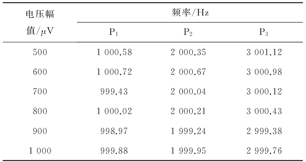 利用信号发生器模拟500~1 000 μV的微小正弦信号,在3个频率点(P1点(1 000 Hz)、P2点(2 000 Hz)、P3点(3 000 Hz))分别进行测试,每个点测量3次并取平均值,测量频率见表1。从表1可以看出,测得的频率误差不到0.5%,验证了该仪器的准确性与可靠性。