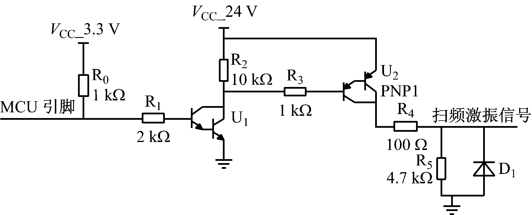 传感器的正常工作首先需要依靠外部采集仪器对传感器内部钢弦进行激振[4]。扫频激振电路以连续变化的频率信号输出至传感器以激励其内部钢弦,当扫频信号的可靠输出频率和传感器内部钢弦的固有频率接近时,钢弦就能够迅速达到可靠共振状态。现有此类钢弦式压力监测传感器的固有频率范围都在400~5 000 Hz,所以,矿压监测采集仪器通过软件使单片机输出频率为400~5 000 Hz的方波激励信号,经过扫频激振电路后激发传感器内部钢弦起振,再对传感器反馈的信号频率脉冲个数进行计数,以判断钢弦是否可靠起振,一般认为反馈脉冲大于12个即为可靠起振。如果没有可靠起振则自动调节输出频率进行重复激振,如果已可靠起振,则进行下一步测量计算。扫频激振电路如图2所示。