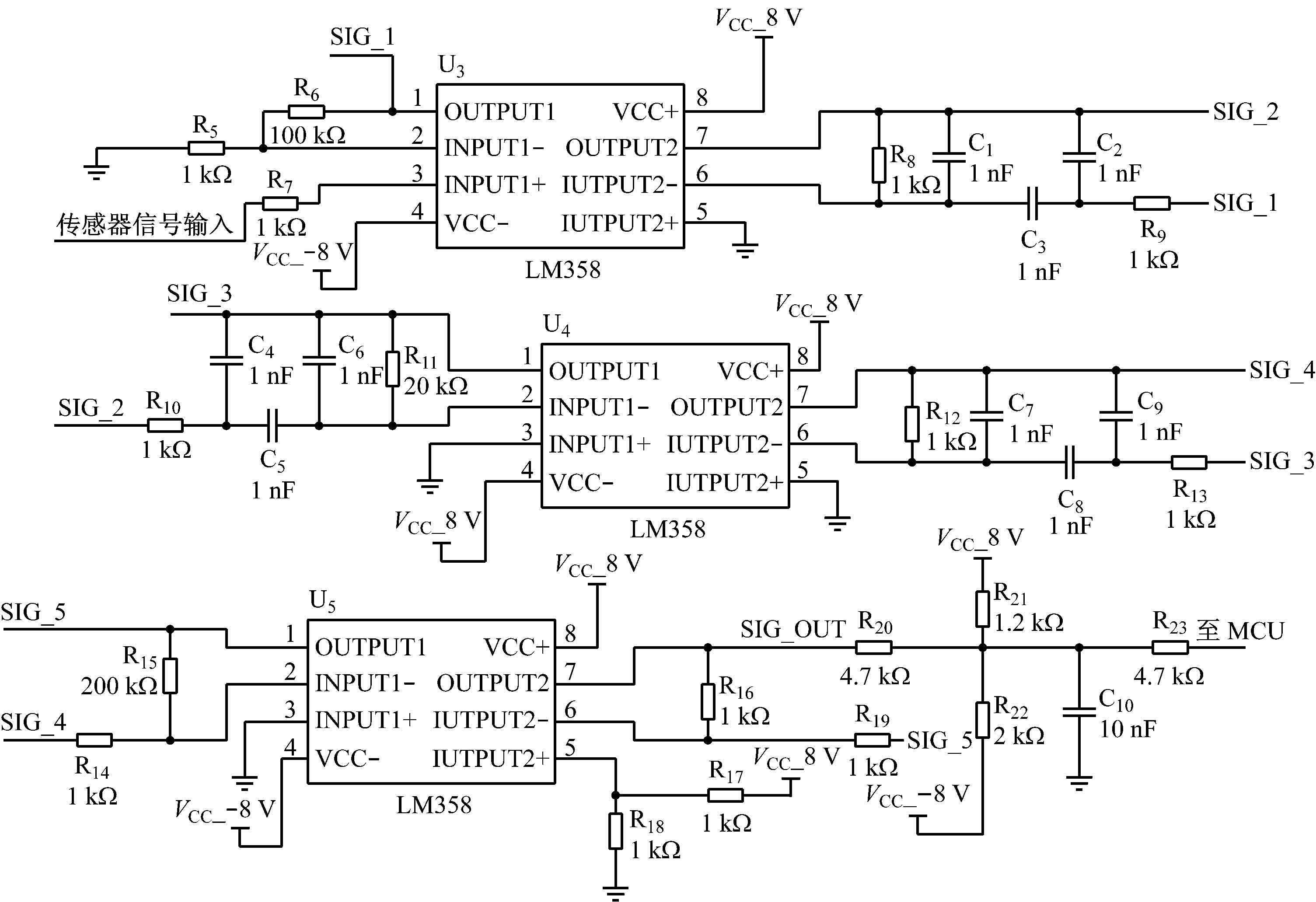 信号调理电路选用LM358运算放大器,LM358内部包括2个独立的双运算放大器,本仪器中,其工作于±8 V双电源模式下。信号调理电路如图4所示。
