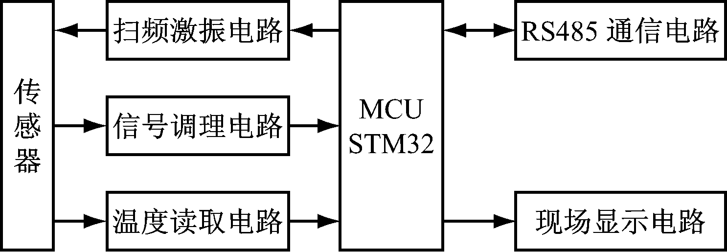 根据钢弦式压力监测传感器的工作特点,设计了一种基于自适应反馈式扫频激振技术的矿压监测采集仪器,基本结构如图1所示。该仪器采用STM32为主控芯片,通过扫频激振电路激发传感器内部钢弦,传感器反馈频率信号经过信号调理电路接入STM32,同时STM32采集现场温度;STM32对接入信号进行处理,处理得到的数据一方面直接用于现场显示,一方面存储在单片机内,并通过RS485总线与地面计算机实现实时双向通信。