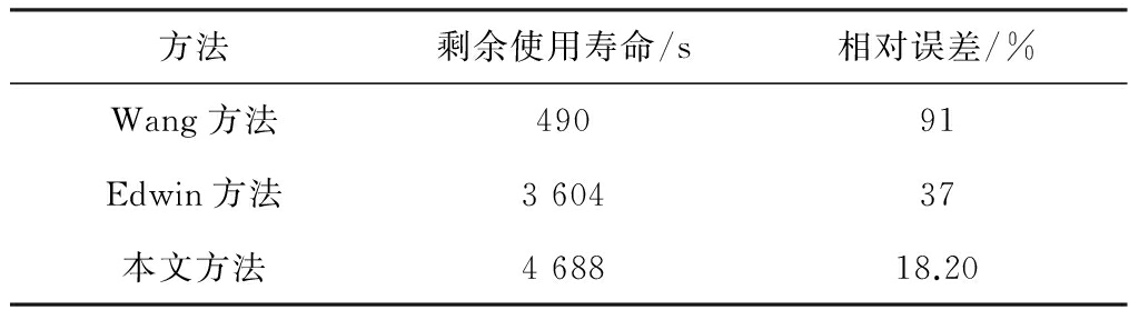 由式(8)可得轴承3测试截止时刻的剩余使用寿命为4 688 s,预测准确率为81.8%,相对误差为-18.2%,负值说明是滞后预测。几种预测方法的预测结果对比见表4。