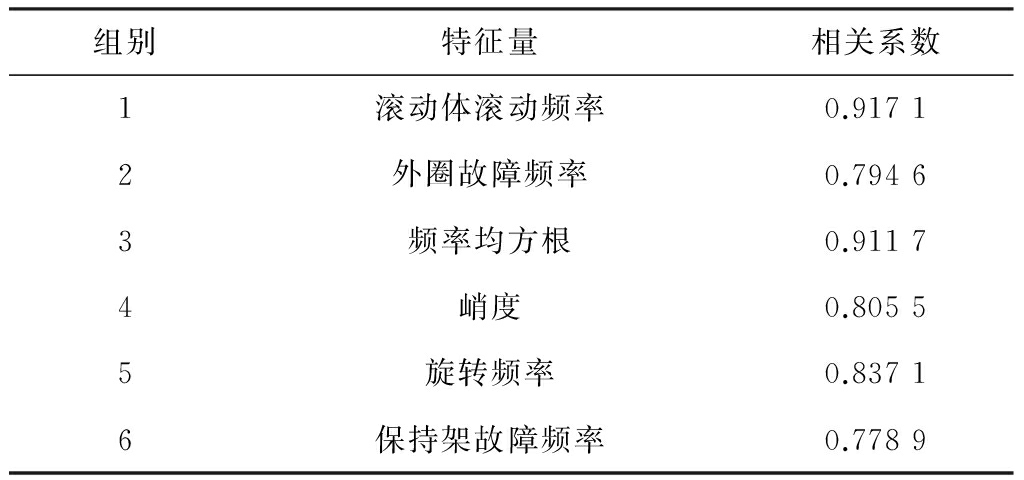 首先,对6组原始数据进行消噪处理和时域、频域特征量提取。时域特征量包括最大值、最小值、绝对平均值、峰峰值、均方根、平均值、标准差、偏态值、峭度、方差、波形因子、波峰因子、变异系数、峭度系数、余隙因子、脉冲因子。频域特征量包括平均频率、中心频率、频率均方根、频率标准差、旋转频率、滚动体滚动频率、通过频率、滚动体上一固定点和内外滚道的接触频率、相对旋转频率、外圈固定时滚动体和内滚道上一固定点间的接触频率、保持架故障频率、滚动体故障频率、外圈故障频率以及内圈故障频率。