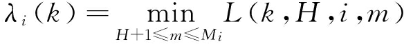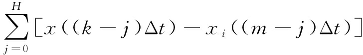 距离函数用来衡量2组数据之间的相似程度,常用的有欧几里德距离函数、Minkowski距离函数、Chebyshev距离函数、方差加权距离函数等。本文选择欧几里德距离函数来衡量从预测数据与样本数据中提取出的特征量之间的相似程度[12]。用式(2)计算预测数据从第k-H个到第k个采样点时段((k-H)Δt,kΔt)中的特征量与样本数据i从第m-H个到第m个采样点时段((m-H)Δt,mΔt)中的特征量的欧氏距离。