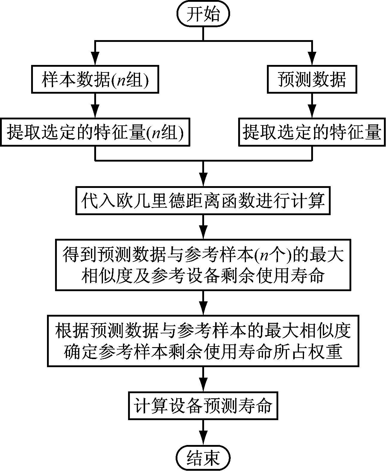 首先从样本数据和预测数据中提取出经过相关性分析选定的特征量,将特征量代入欧几里德距离函数,得到样本数据与预测数据之间的最大相似程度和参考设备剩余使用寿命;然后根据最大相似程度确定每个参考设备剩余使用寿命的权重,最后计算参考设备剩余使用寿命的加权和,得到预测结果。
