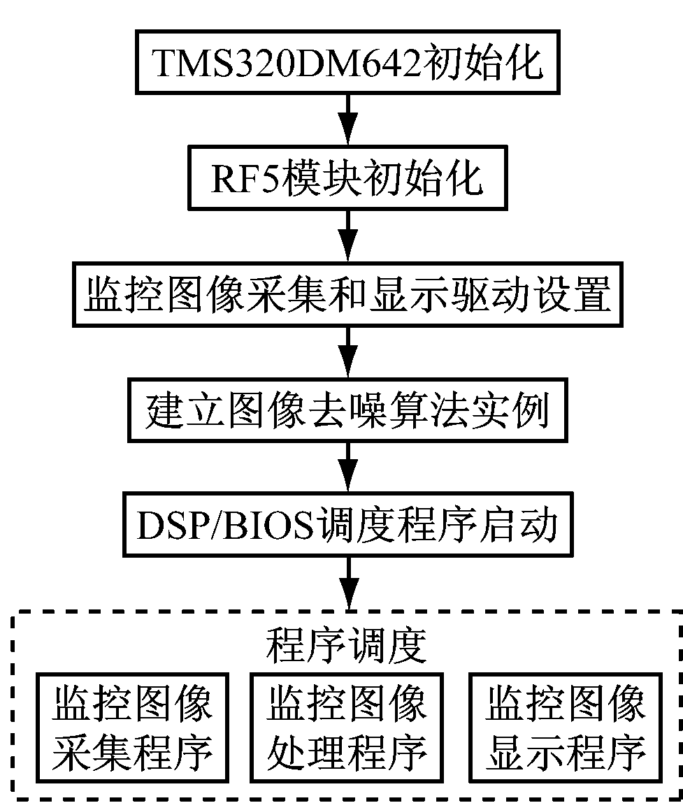 本装置采用模块化的理念来完成软件设计[4]。整个装置的软件由初始化、监控图像采集、监控图像处理以及监控图像显示4个模块组成。