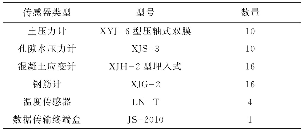 每个现场测试断面上布设有土压力计、孔隙水压力计、混凝土应变计、钢筋计和温度传感器等[5],如图2所示。