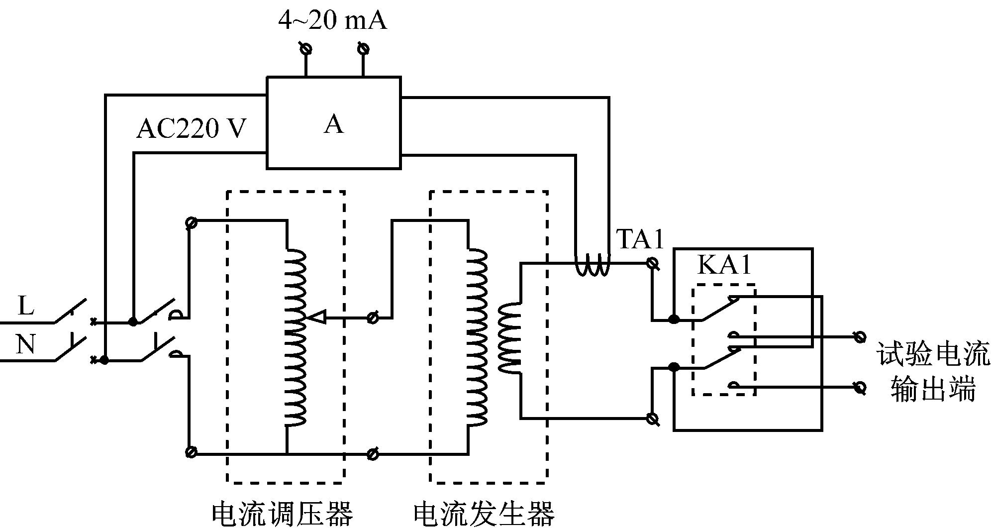 高压真空开关正常工作时,输入高压保护器的电流信号为0~5 A。参照GB 8286—2005对矿用高压真空开关短路和过载信号的规定,设计了0~50 A可调电流发生器。电流试验电路如图2所示。电流发生器二次侧通过50∶5的精密电流互感器TA1,接入到测试台仪表盘上的电流表,同时该电流表产生4~20 mA信号。该信号接入PLC,实现PLC对电流信号的实时采集。考虑到电流发生器不能开路运行,在电流发生器和高压保护器之间加入自锁继电器KA1。在进行电流试验时,KA1闭合,将电流信号接入高压保护器;不进行电流试验时,KA1常闭触点接通电流发生器的输出端,以防止误操作而损害电流发生器。