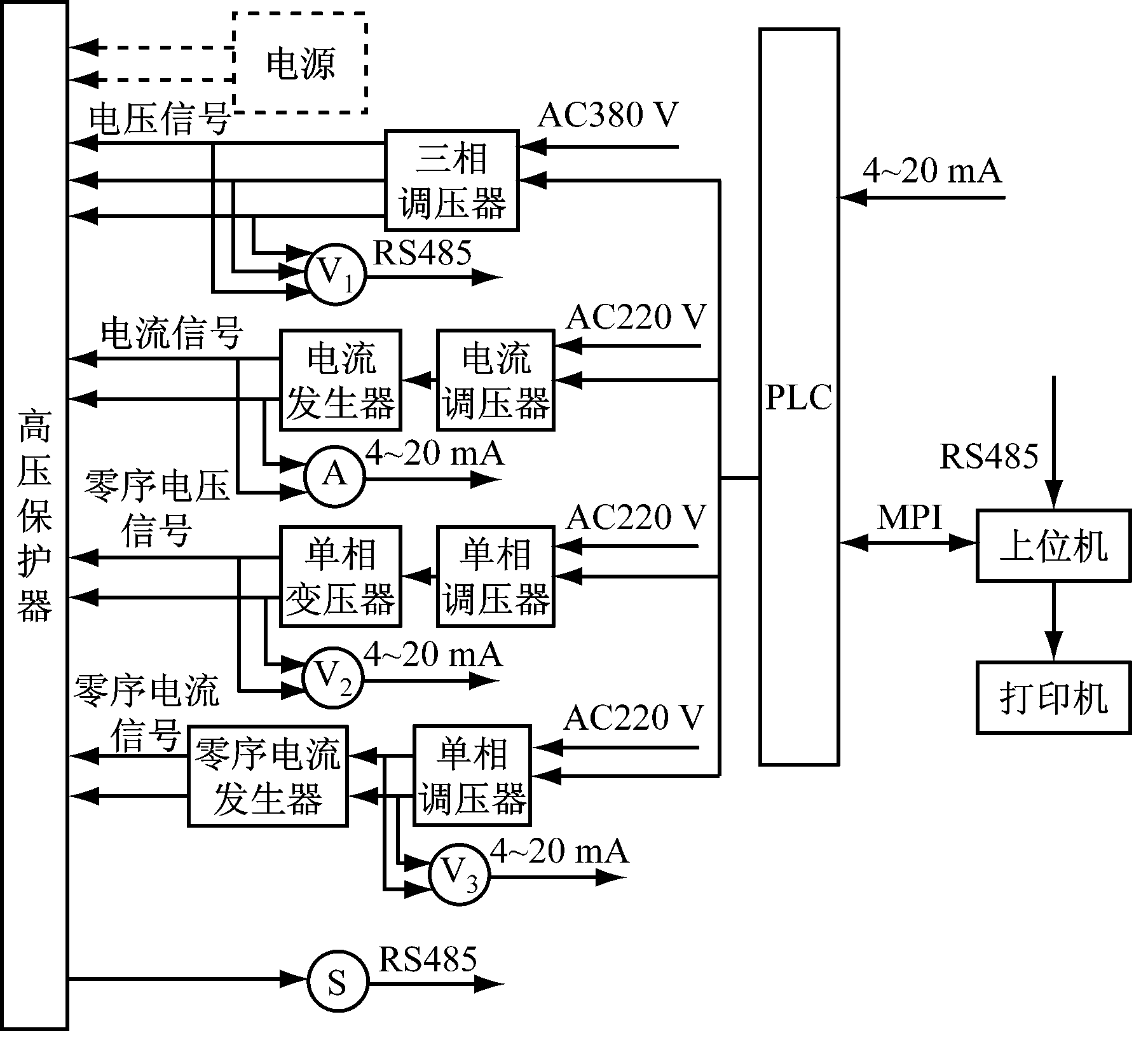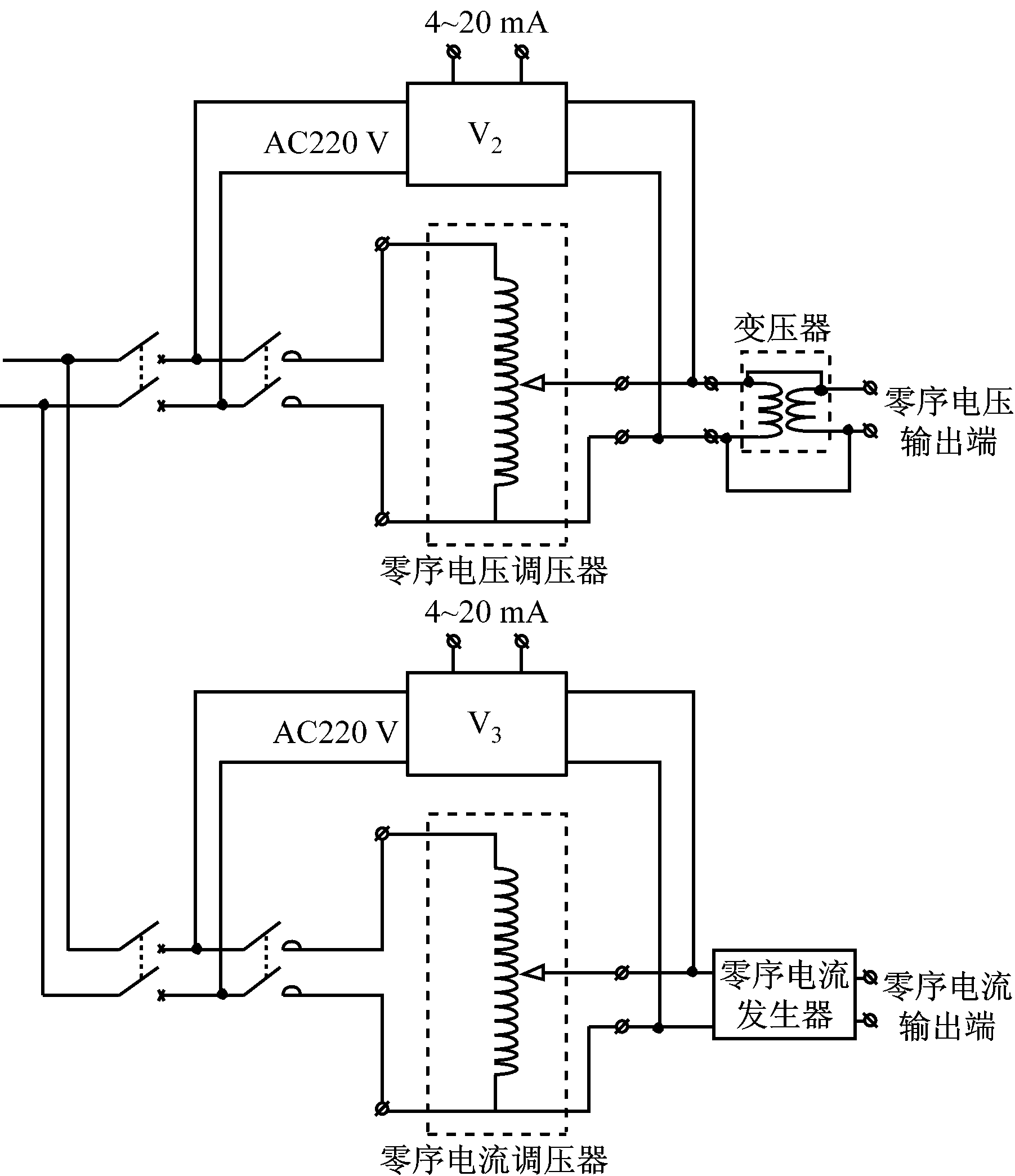 以ZBT-11高压保护器为例,首先经单相调压器产生5倍的电压信号,再经过变比为220∶44的变压器接入高压保护器零序电压输入端。零序电流发生器产生的零序电流信号与输入该发生器的电压成正比,PLC通过采集电压信号即可计算出零序电流信号值。