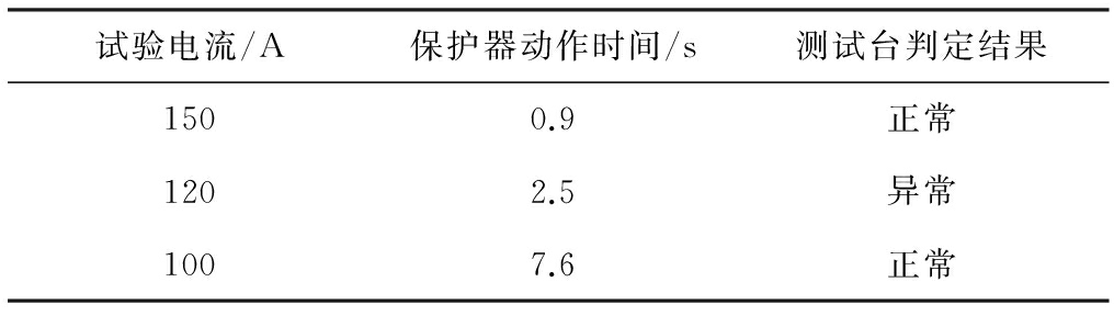 以ZBT-11高压保护器电流保护功能为例进行测试台功能检测。按照该煤矿要求设置整定参数:额定电流为100 A;过流整定倍数为1.2倍,保护时间为1.0 s;过载整定倍数为1.0倍,保护时间为8.0 s。表1为电流保护功能检测结果,当测试台提供120 A过流信号时,高压保护器的动作时间为2.5 s,远大于设定值。在实际应用中,该高压保护器无法及时切断过流线路,造成极大的安全隐患。因此,测试台判定该保护器的过流保护功能存在异常。