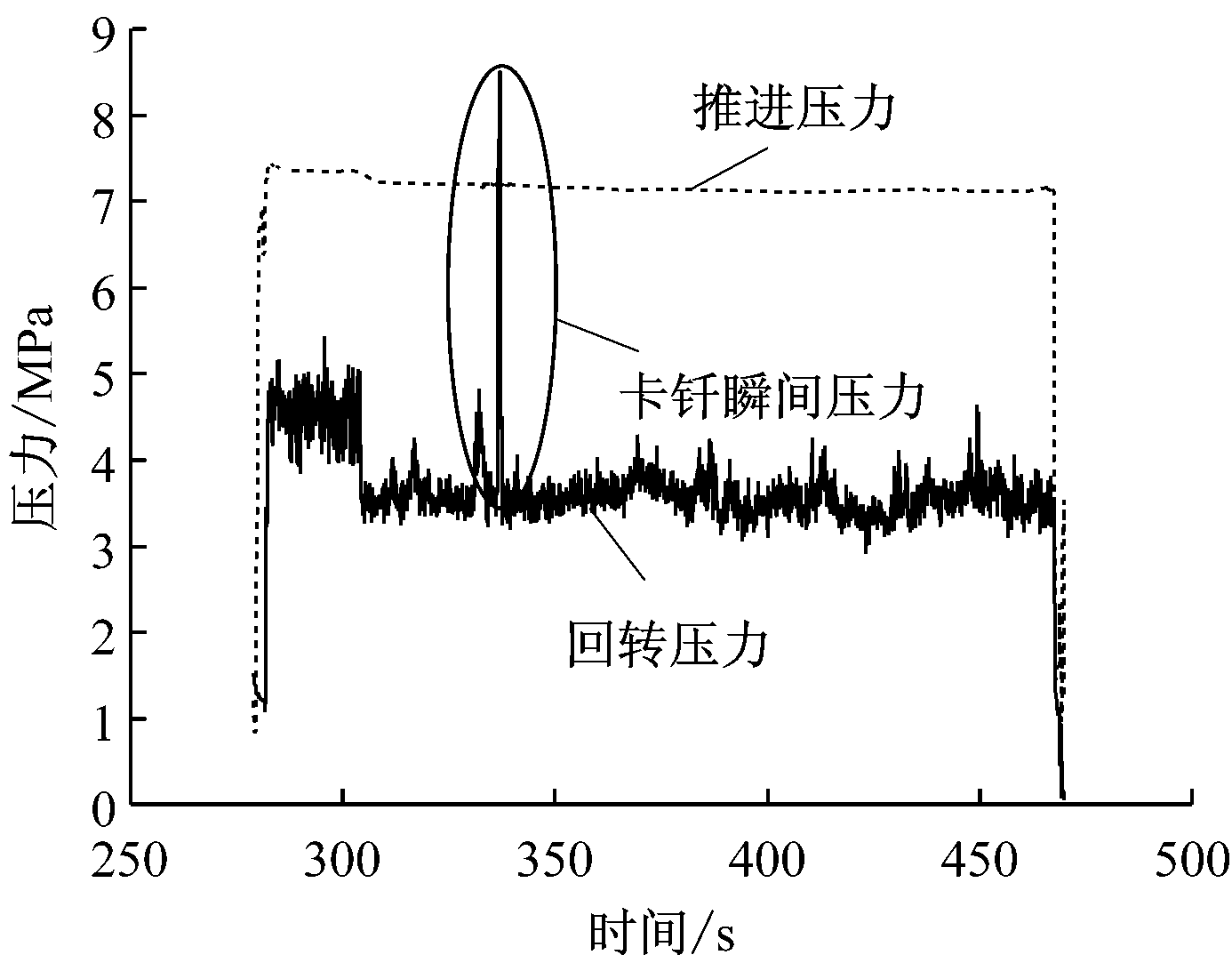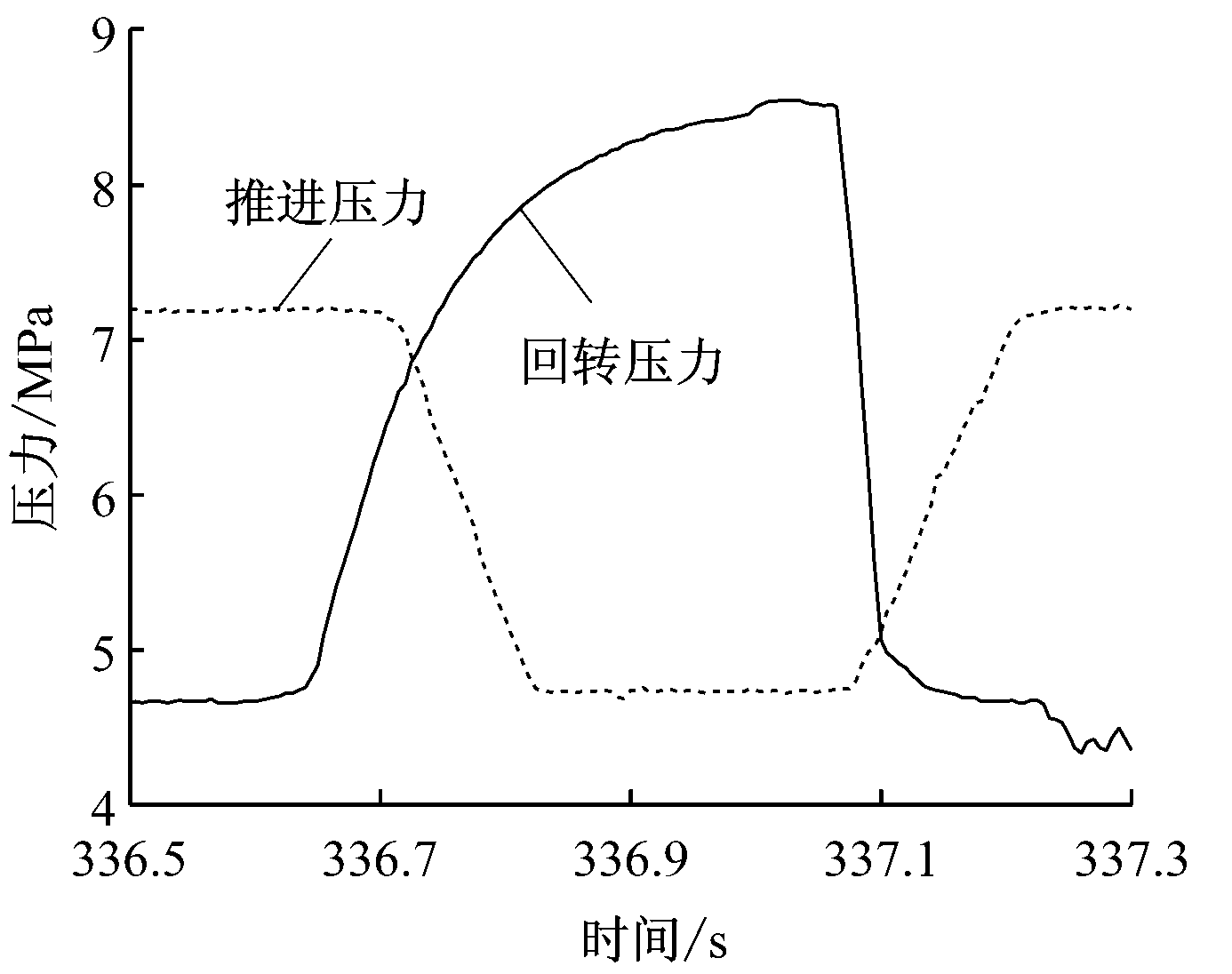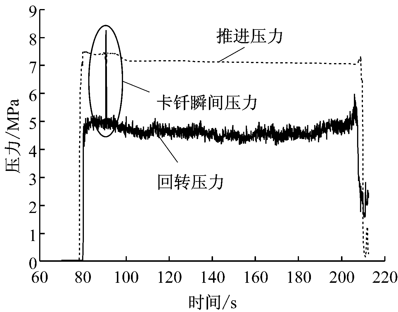 现场实验主要考察推进器的推进压力随孔内因素变化时的反应特性。由于BP神经网络模型是建立在大量训练样本基础之上,因此,训练样本应该足够大。将防卡阀应用在某国产露天凿岩钻车上,现场实验时, 在推进油缸的进出油口、凿岩机回转发动机的进出油口分别安装压力传感器,经采集模块连接至计算机测试软件,测量在钻孔工作过程中各处压力的变化情况。