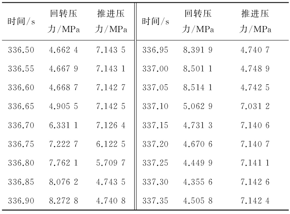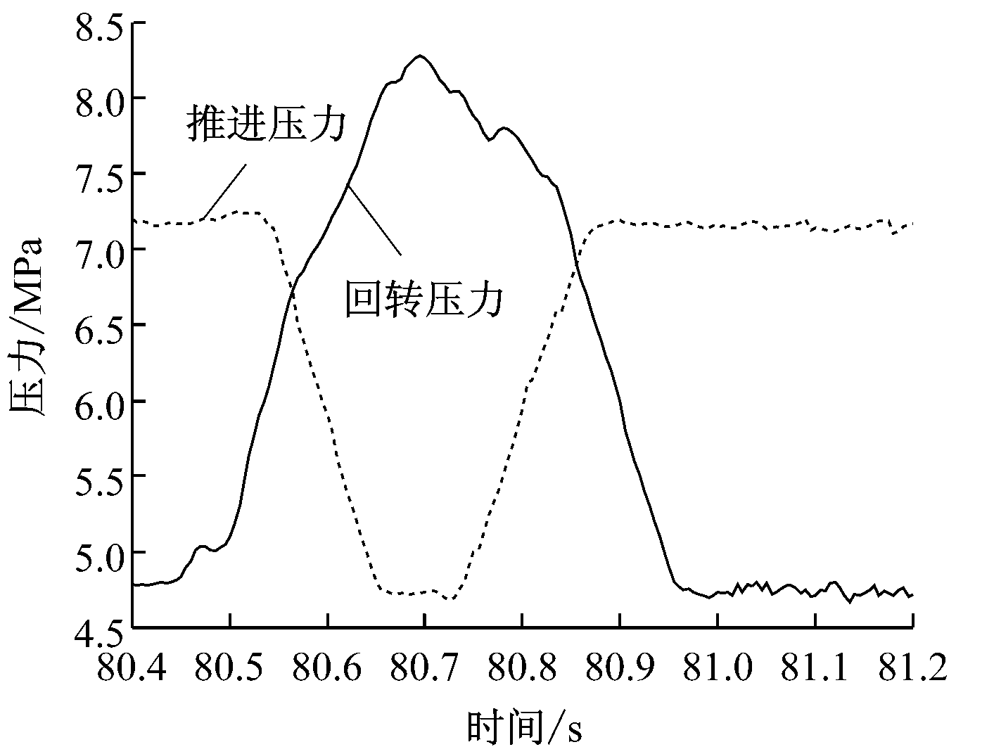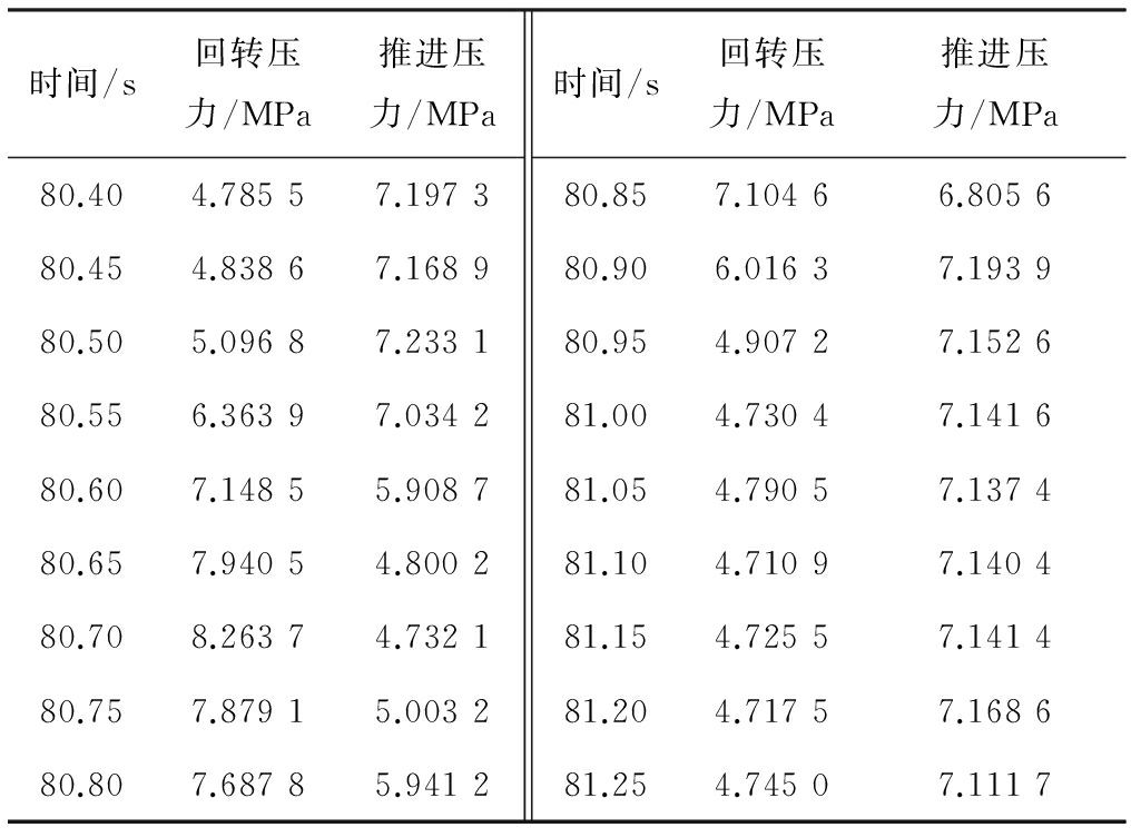现场实验主要考察推进器的推进压力随孔内因素变化时的反应特性。由于BP神经网络模型是建立在大量训练样本基础之上,因此,训练样本应该足够大。将防卡阀应用在某国产露天凿岩钻车上,现场实验时, 在推进油缸的进出油口、凿岩机回转发动机的进出油口分别安装压力传感器,经采集模块连接至计算机测试软件,测量在钻孔工作过程中各处压力的变化情况。