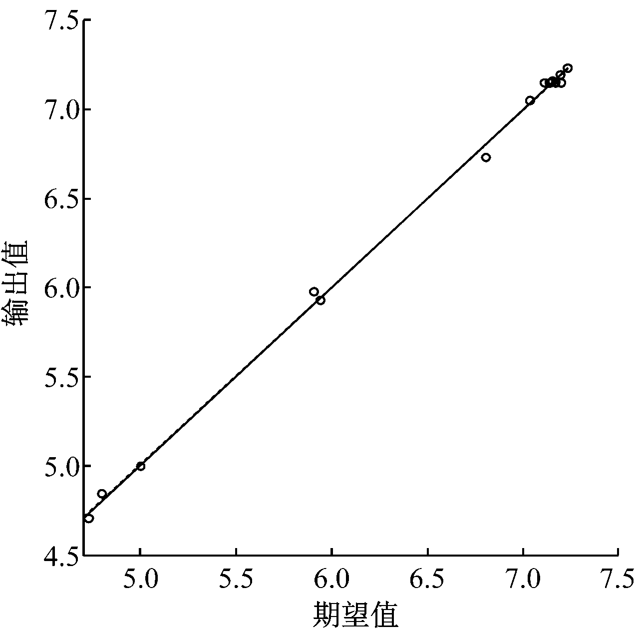 训练过程存在一定的随机性,需要对训练结果进行检测以保证其准确性,网络训练输出值和期望值的线性回归分析如图7所示,相关系数为0.999 36,拟合度越接近1,表明网络输出值对期望值的追踪效果越好。