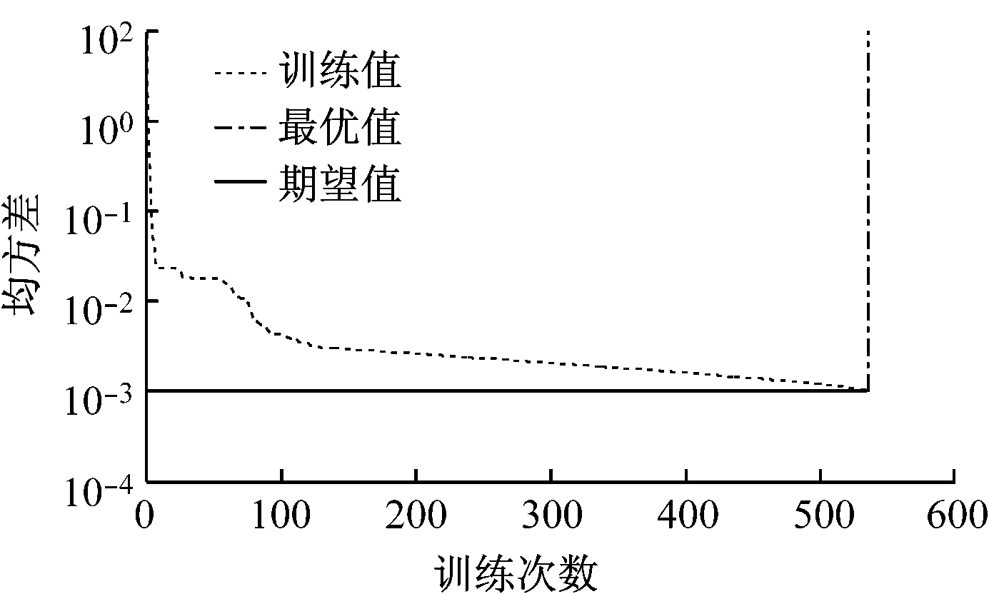 训练过程的均方差(Mean Squared Error,MSE)曲线如图6所示。在训练次数为535次时,均方差达到10-3。均方差越小,预测值就越接近期望值,但相应的训练次数会增加,影响网络训练的速度,甚至陷入死循环。结合预测结果进行综合考虑,均方差选为10-3,既可保证预测结果的准确性,又不会影响训练过程的快速性,具有较高的灵敏度。